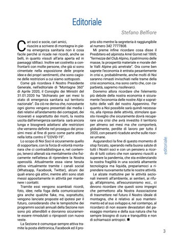 Editoriale prio sito mentre la segreteria è raggiungibile al numero 342 7777808. Mi preme infine ricordare cosa disse il Presbitero ed alpinista Amé Gorret nel 1869; “fermezze del Club Alpino, il patrimonio delle masse, la prosperità materiale e morale delle Valli Alpine più arretrate”. Ora come ben saprete l’economia è entrata pesantemente in crisi e, probabilmente, anche molti di Noi saranno rimasti invischiati nelle trame della crisi economica, ma sono certo che, con caparbietà, sapremo risollevarci. Dovremo allora ricordare che l’elemento più debole della nostra economia è sicuramente l’economia delle nostre Alpi e soprattutto delle valli del nostro Appennino. Per quanto a Noi possibile sarà quindi necessario, alla ripresa delle attività, stimolare questo risveglio che sicuramente dovrà recuperare una crisi che avrà investito il territorio per almeno sei mesi ma che comporterà, globalmente, perdite di lavoro per tutto il 2020, con pesanti ricadute anche sulle risorse umane. Augurandoci la fine di questo momento di stop forzato, sperando nella buona salute di tutti i Nostri soci e con un pensiero a ricordo di tutti coloro che non saranno riusciti a superare la pandemia, che sta evidenziando la nostra fragilità in una società altamente tecnologica ma liquida, prepariamoci a riprendere nuovamente tutte le nostre attività. Le alzate mattutine per le attività sezionali inerenti all’ambiente, ai sentieri, ai rifugi, all’alpinismo, all’escursionismo ecc., ci devono ricordare che questi sono impegni che permettono alla Nostra Associazione di trasmettere nel futuro il Nostro ideale di montagna, che è relativo al suo mantenimento ed al suo sviluppo e, nel contempo, al ricordarci di non essere devastatori del paesaggio montano e della sua natura che ha sempre bisogno di cura e tranquillità e non di schiamazzi antropici. ■