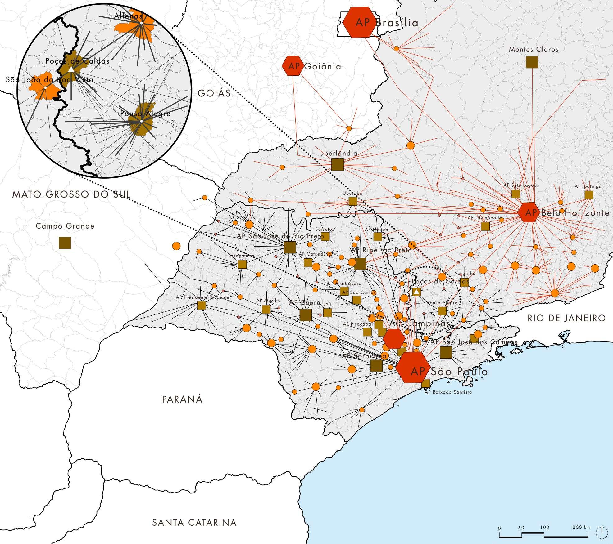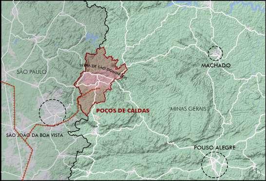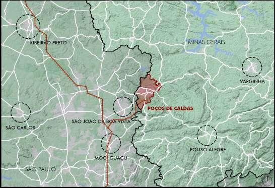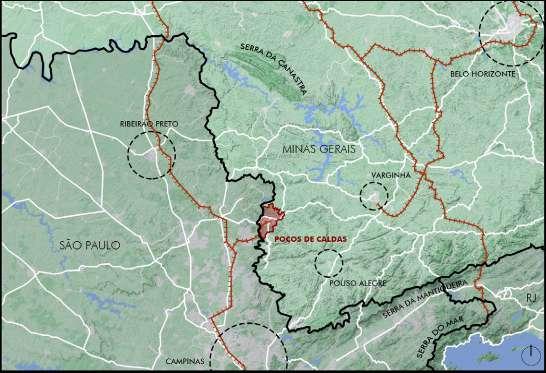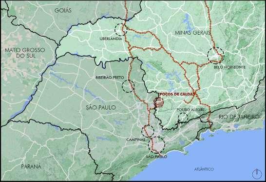 Sendo assim, a partir da análise do Mapa de Relação de Influência entre Ci dades de São Paulo e Minas Gerais ela borado pela equipe, nota-se a conexão de Poços de Caldas com as metrópoles nacionais de Belo Horizonte e São Pau lo. Como o território em questão loca liza-se na divisa com a capital paulista, observa-se ali uma ligação mais inten sa, sobretudo devido ao escoamento de mercadorias e ao turismo. Além disso, observa-se a influência da cidade sobre os demais municípios mineiros, como Pouso Alegre, Alfenas e São João da Boa Vista, principalmente devido à presença de universidades públicas, equipamen tos de relevância metropolitana e aos atrativos oferecidos pelo próprio centro poços-caldense.