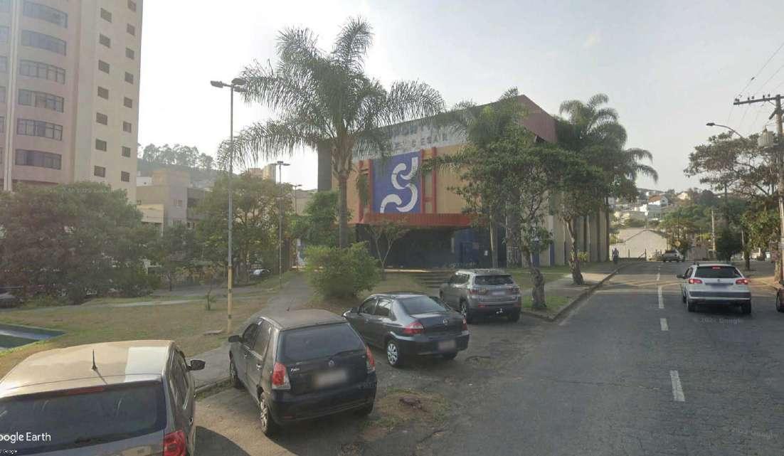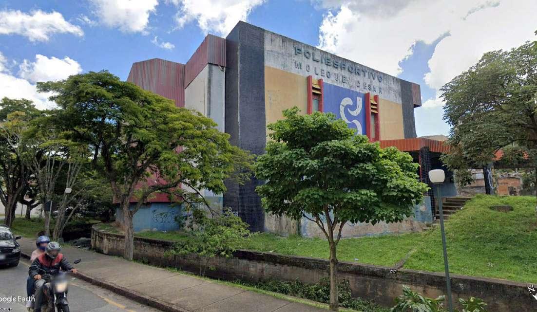 Legenda: Vista do ginásio poliesportivo existente na área, hoje abandonado. Fonte: Google Earth, 2022.