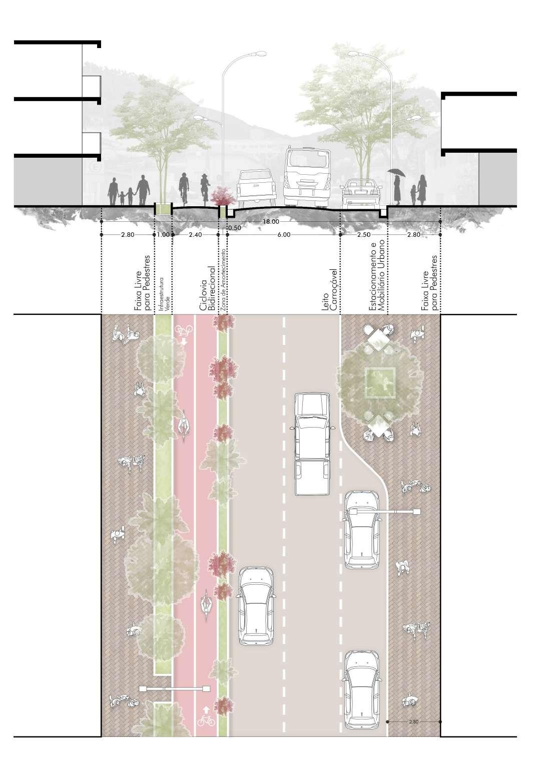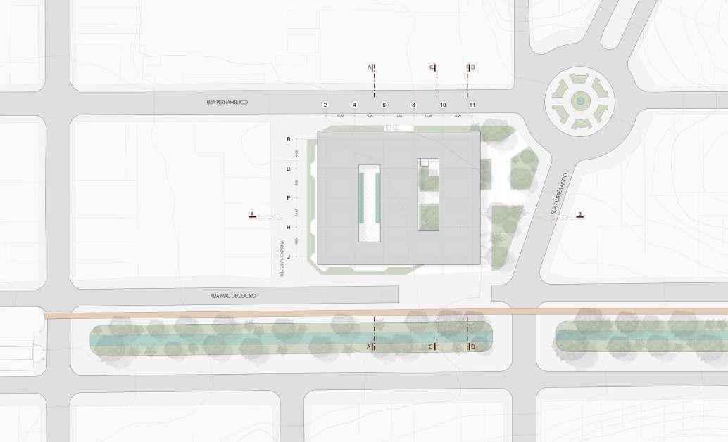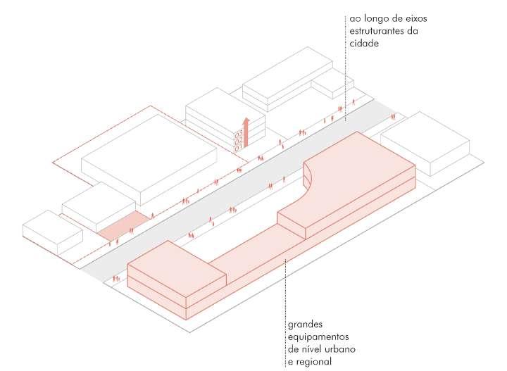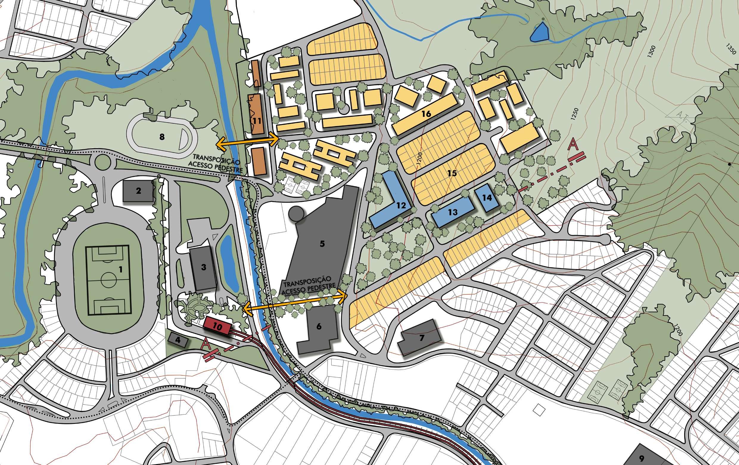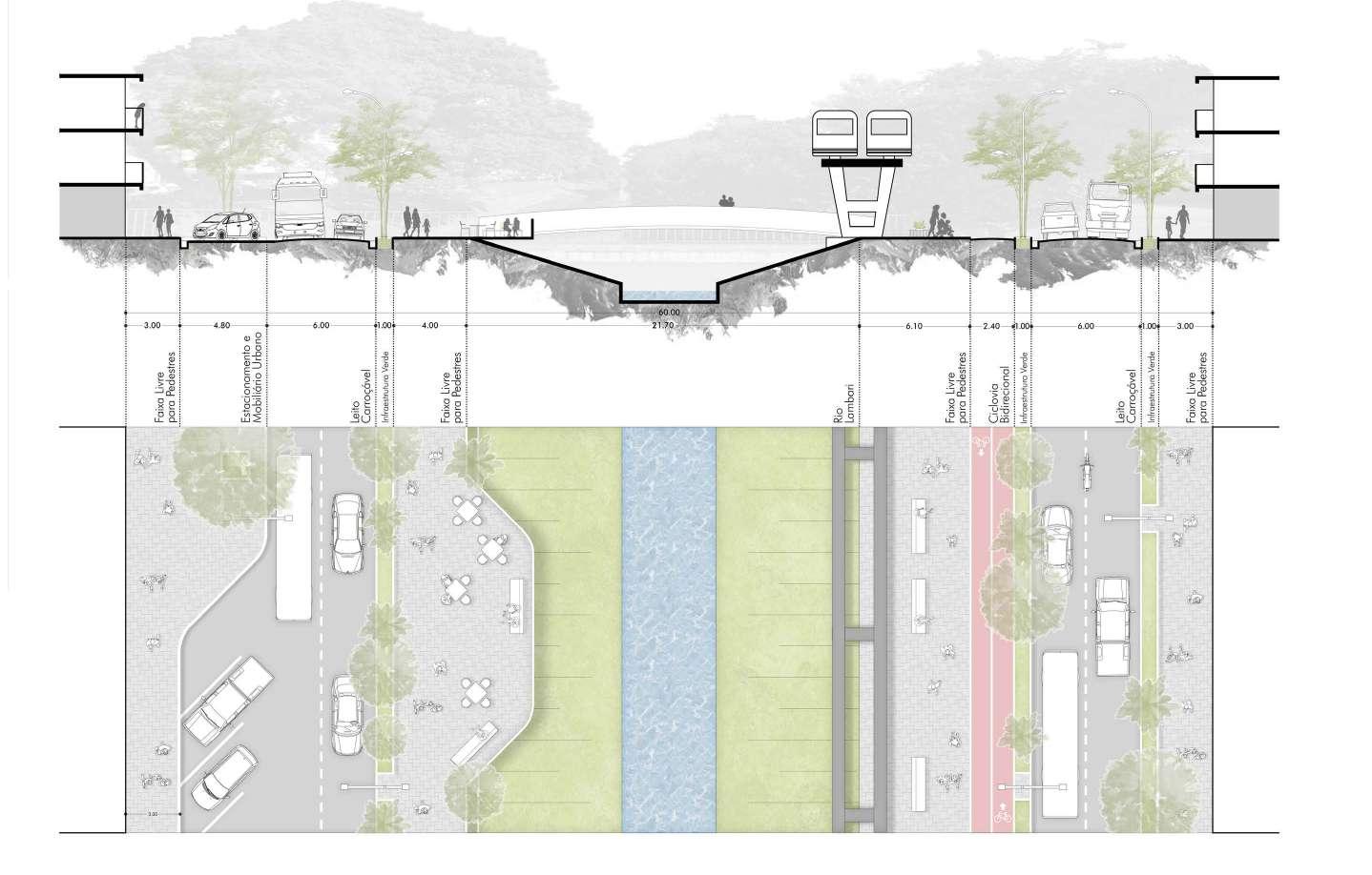 Também propõe-se um replanejamento no espaço urbano imediato a fim de beneficiar o transporte público, permear as quadras adja centes, criar pequenas praças a partir de lotes desocupados, estabelecer eixos cruzando a pro posta, visando sobretudo a valorização do curso d’ água, patrimônio destacado em todo o pro jeto urbano, que deverá ser requalificado como um espaço de permanência em destaque, e não apenas como fundo de um prédio abando nado.