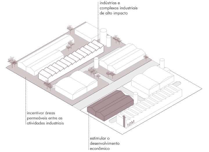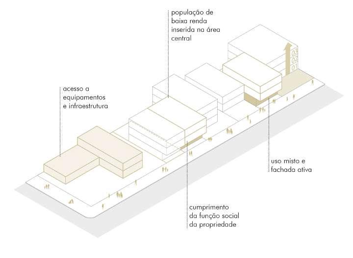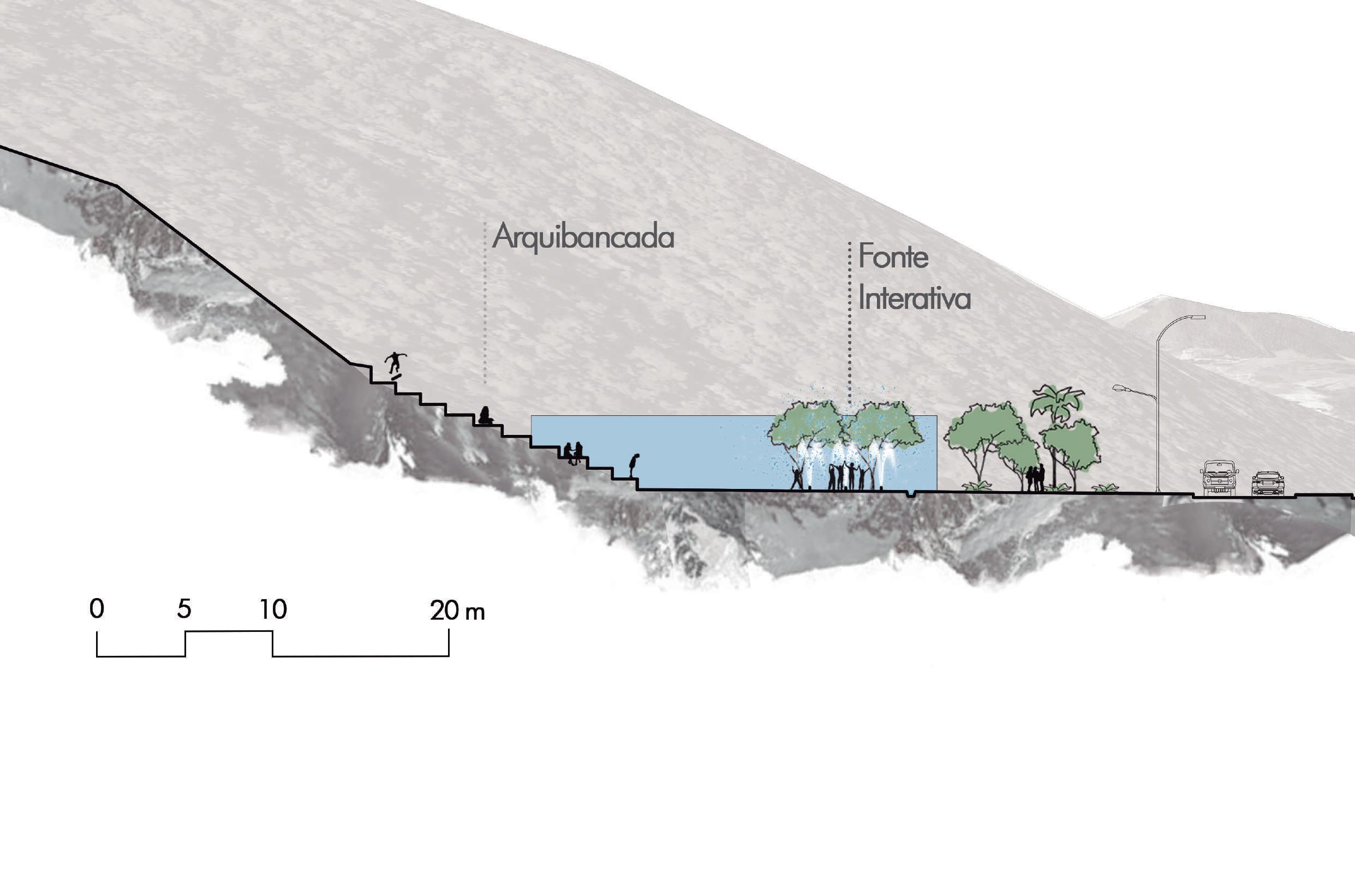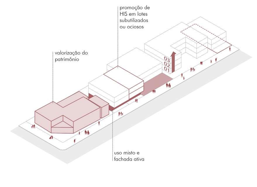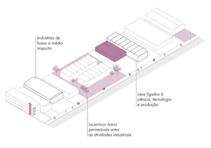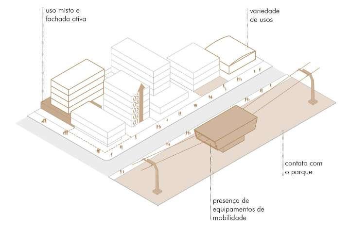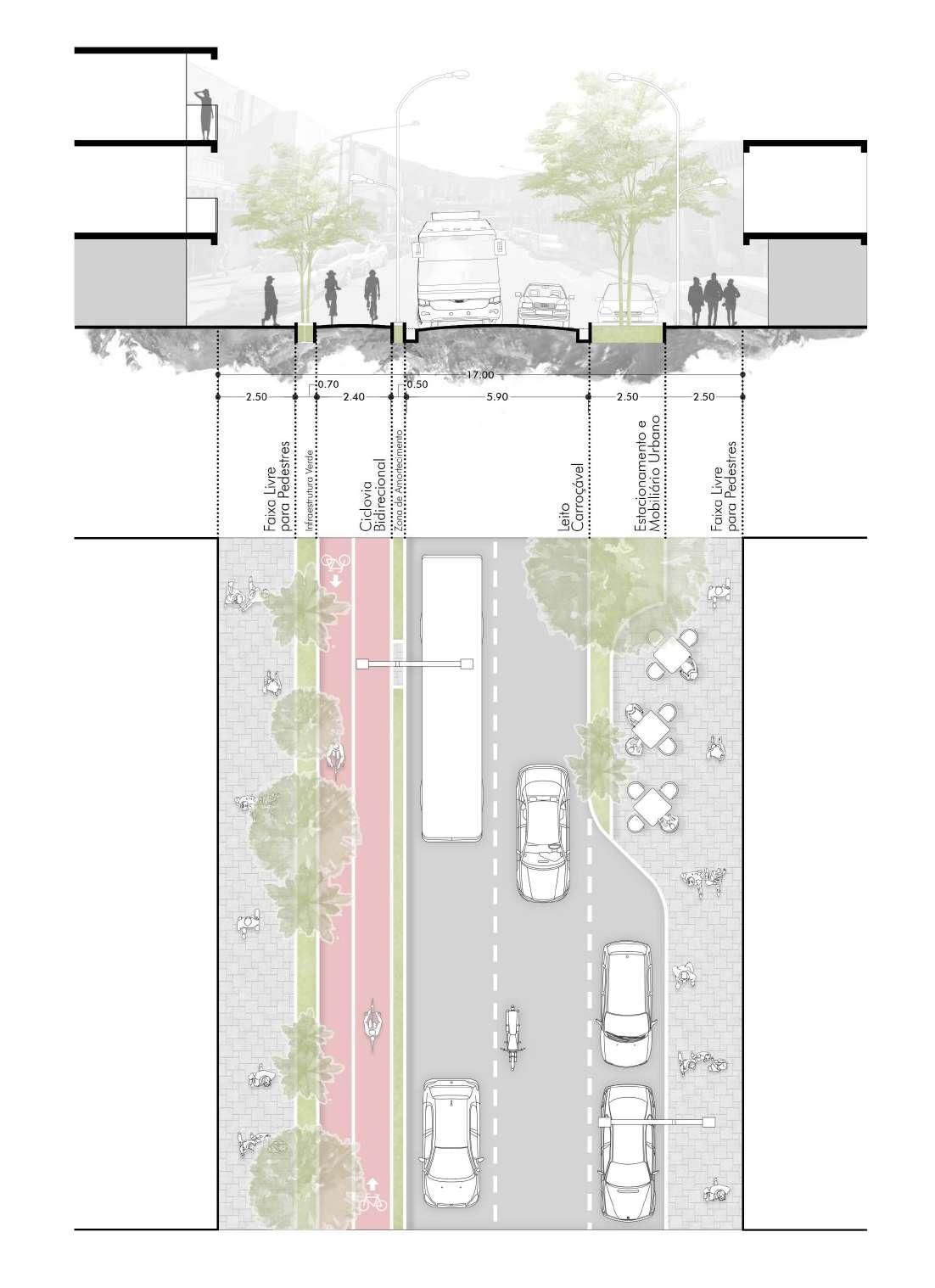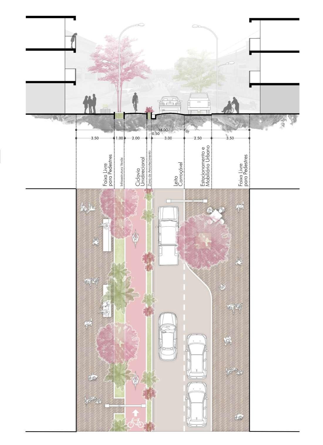Também propõe-se um replanejamento no espaço urbano imediato a fim de beneficiar o transporte público, permear as quadras adja centes, criar pequenas praças a partir de lotes desocupados, estabelecer eixos cruzando a pro posta, visando sobretudo a valorização do curso d’ água, patrimônio destacado em todo o pro jeto urbano, que deverá ser requalificado como um espaço de permanência em destaque, e não apenas como fundo de um prédio abando nado.