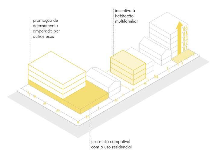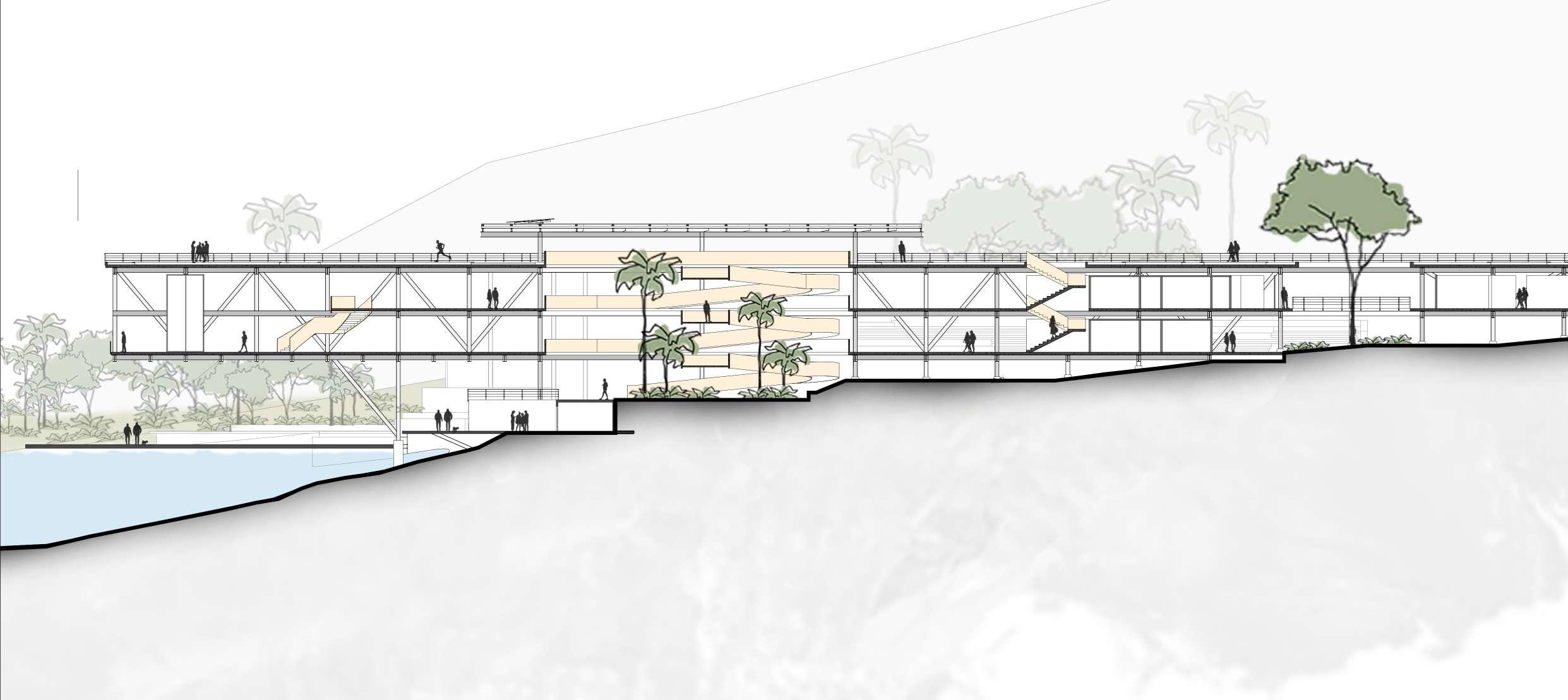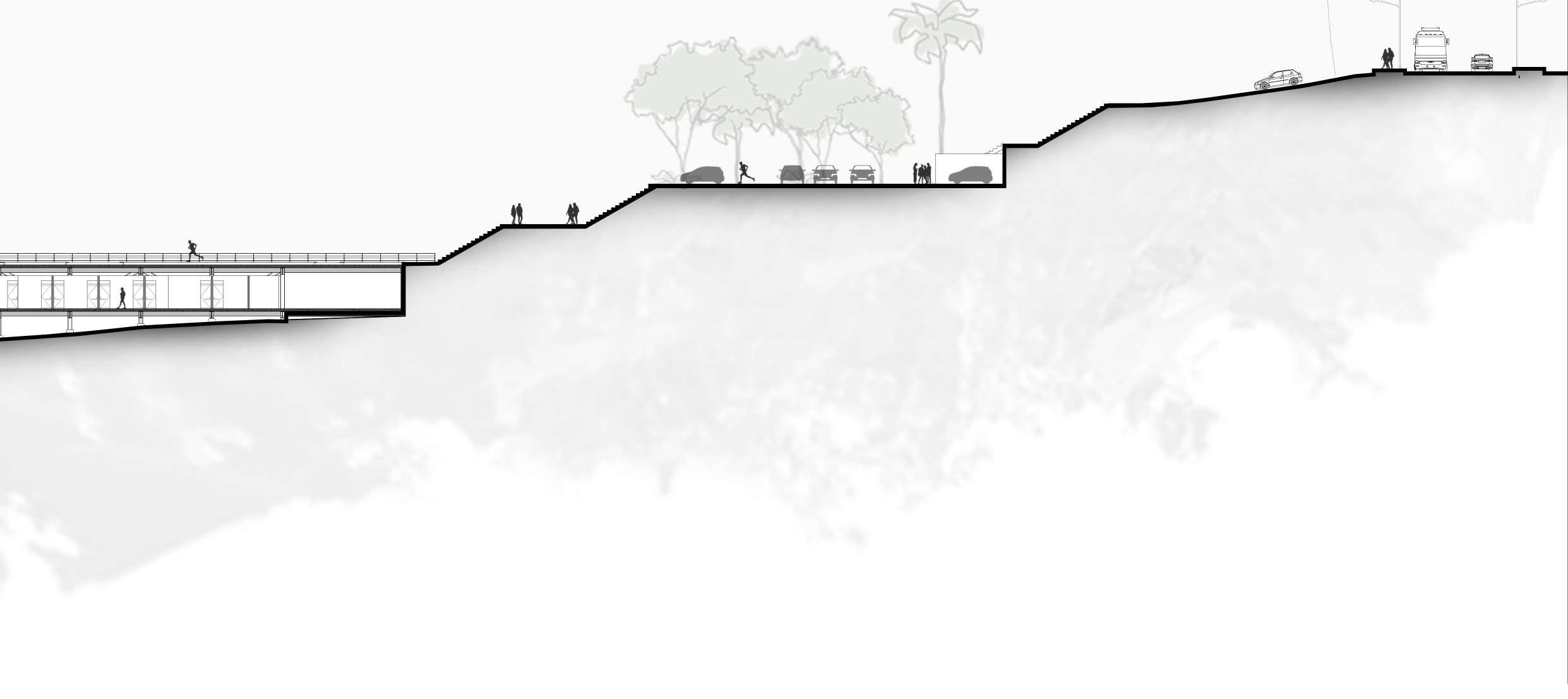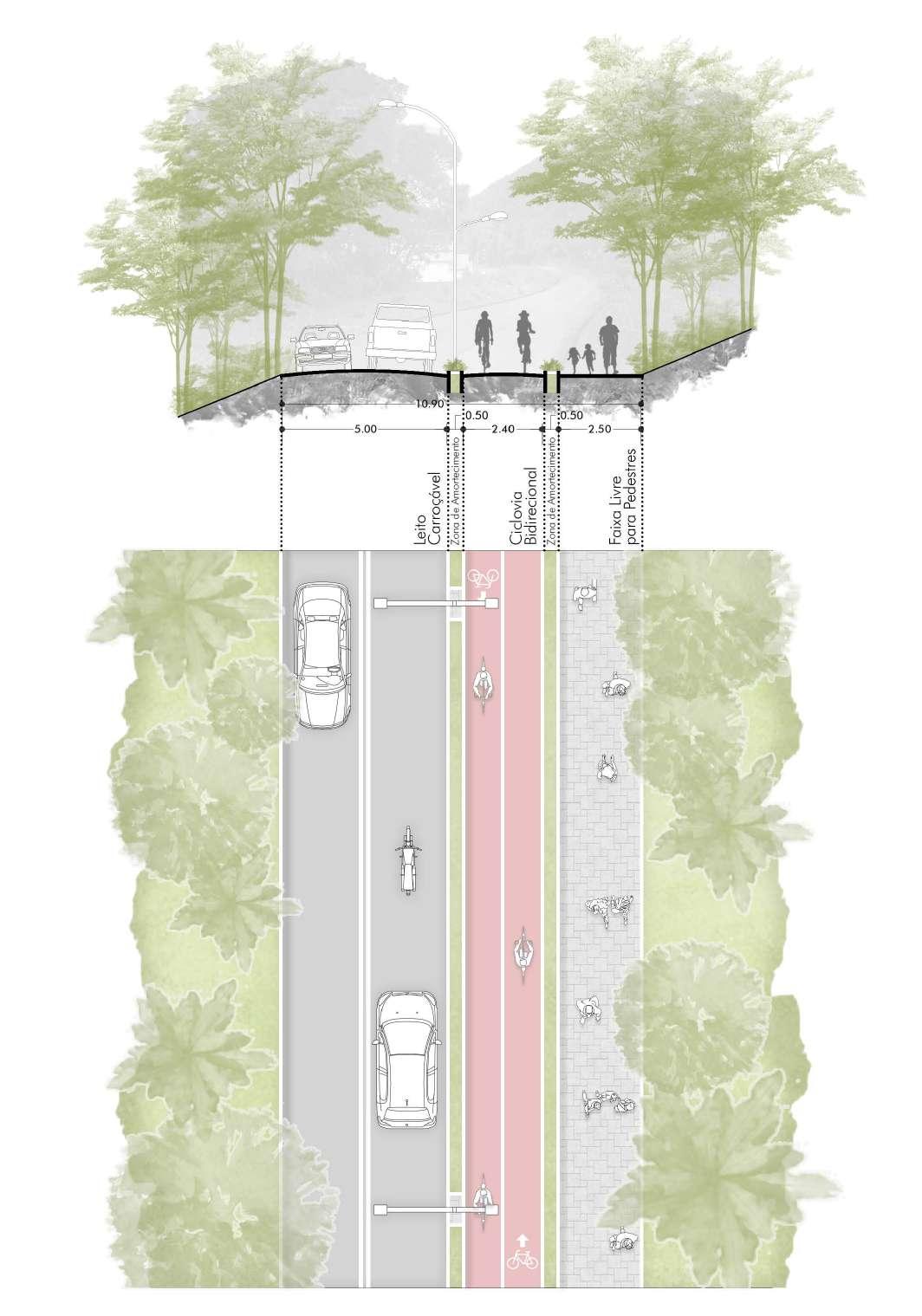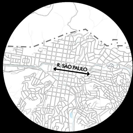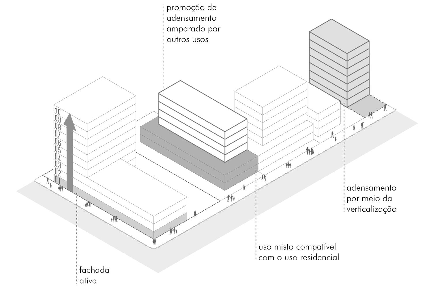 Também propõe-se um replanejamento no espaço urbano imediato a fim de beneficiar o transporte público, permear as quadras adja centes, criar pequenas praças a partir de lotes desocupados, estabelecer eixos cruzando a pro posta, visando sobretudo a valorização do curso d’ água, patrimônio destacado em todo o pro jeto urbano, que deverá ser requalificado como um espaço de permanência em destaque, e não apenas como fundo de um prédio abando nado.