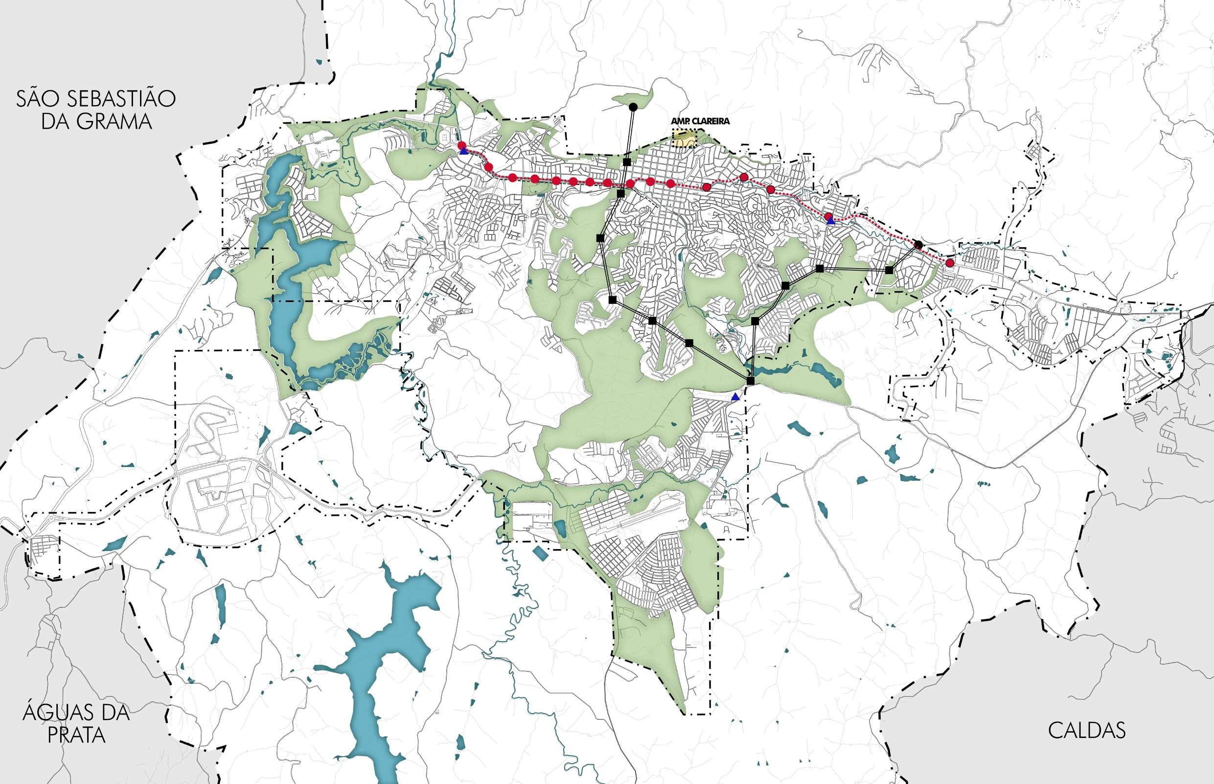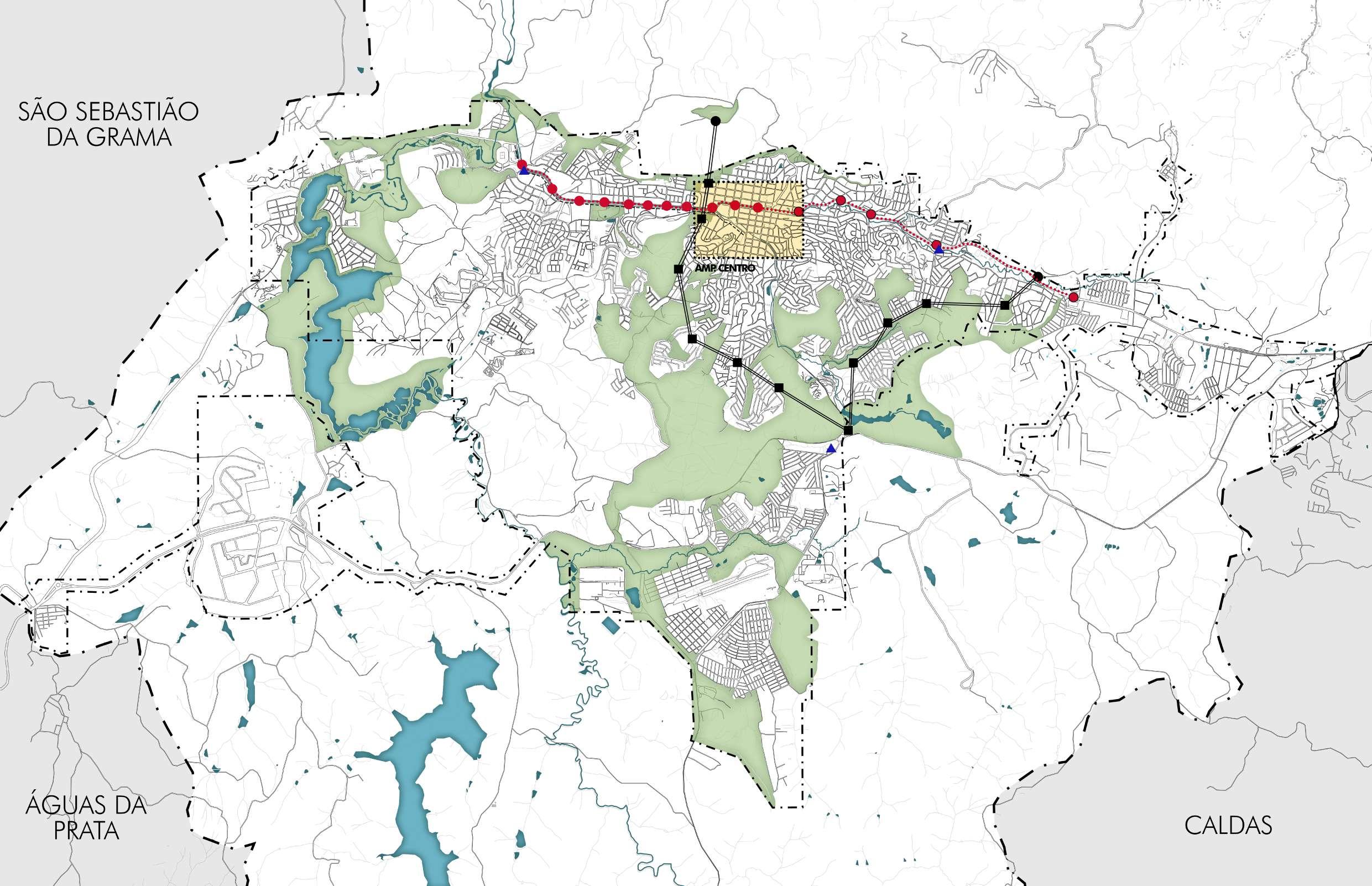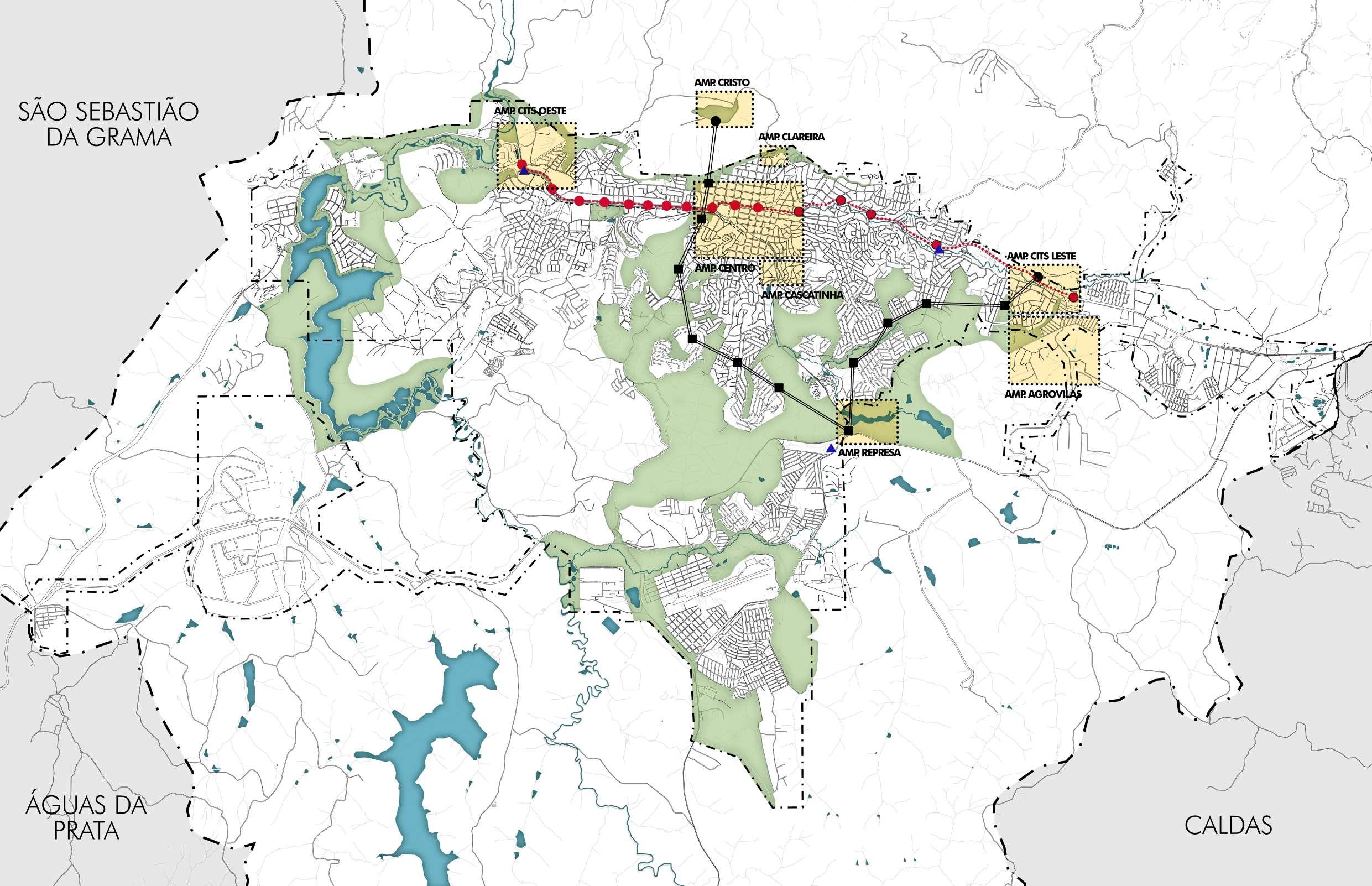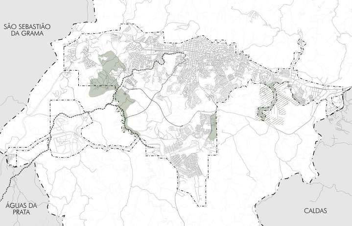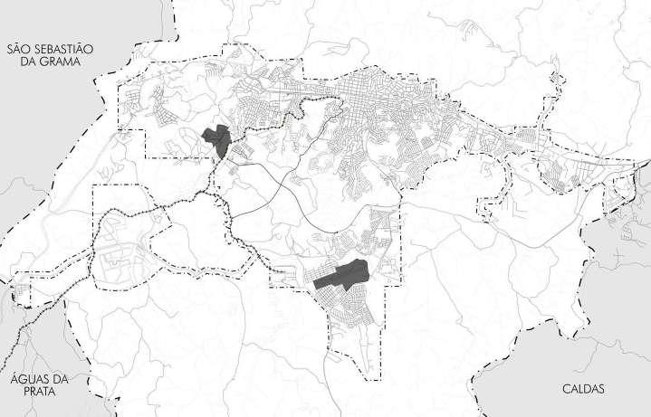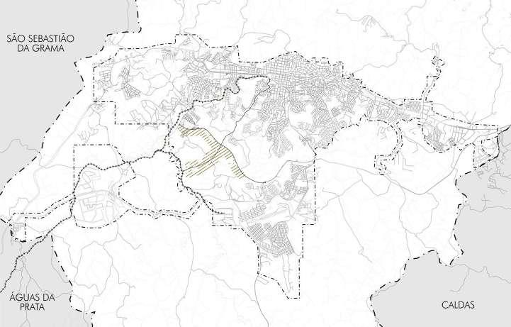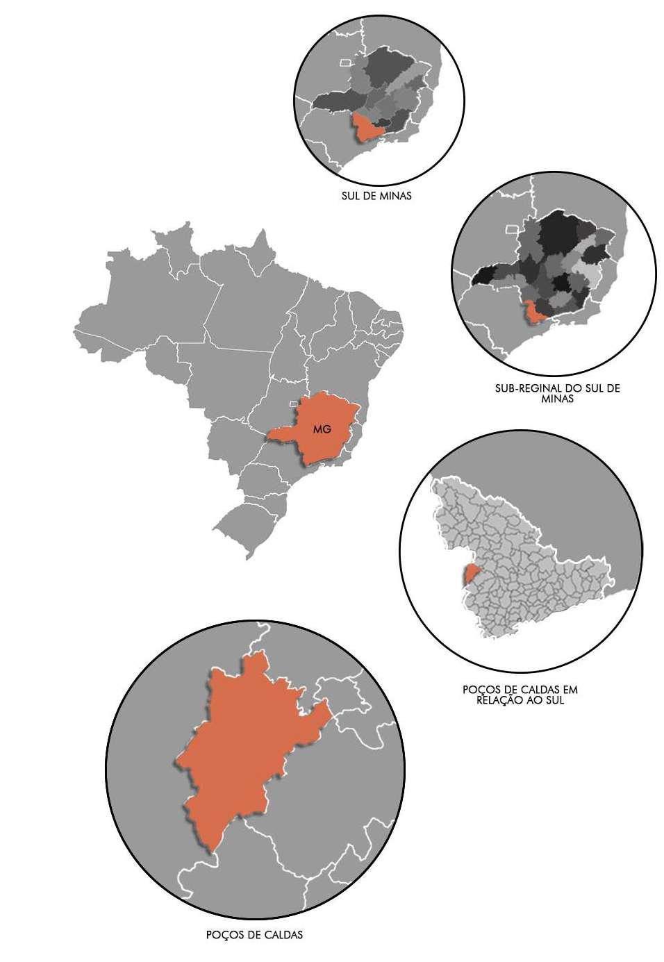 A definição do município a ser estudado se deu a partir de discussões e consequente levantamento de temáticas relevantes para a equipe, tais como as questões identitárias e de memória do território, a vulnerabilida de socioespacial, a relação centro-periferia, as fragilidades ambientais e o papel dos espaços livres públicos. Dentre as opções debatidas, Poços de Caldas, além de abran ger as proposições supracitadas, se sobres saiu principalmente devido à particularida de de seu vínculo com a natureza e de sua identidade relacionada à água e ao turismo sanitarista. Nesse sentido, listam-se carac terísticas que despertaram o interesse do grupo e nortearam o ponto de partida para o desenvolvimento do trabalho: