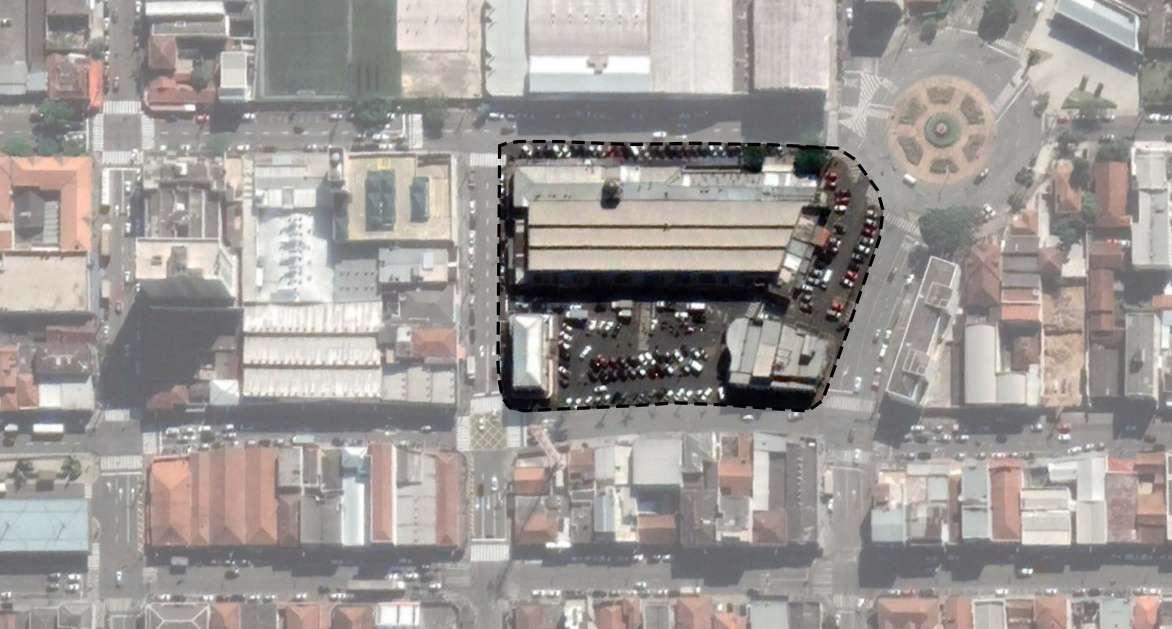 Legenda: Implantação do Mercado Municipal sobre base aérea do Google Earth. Fonte: Ana Laura Scavassa Magro, 2022. Legenda: Implantação esquemática do Mercado Municipal. Fonte: Ana Laura Scavassa Magro, 2022.