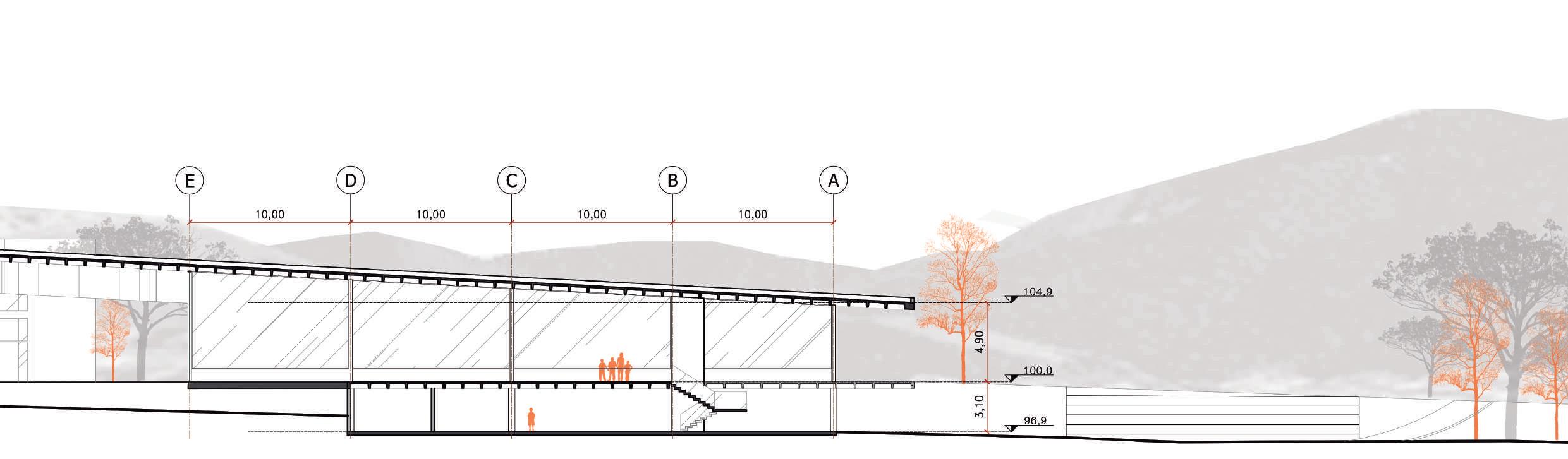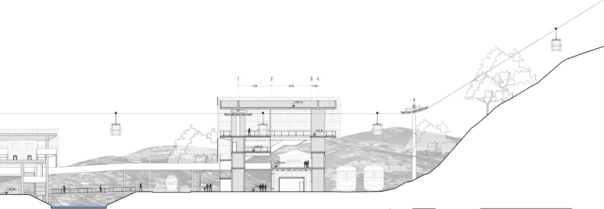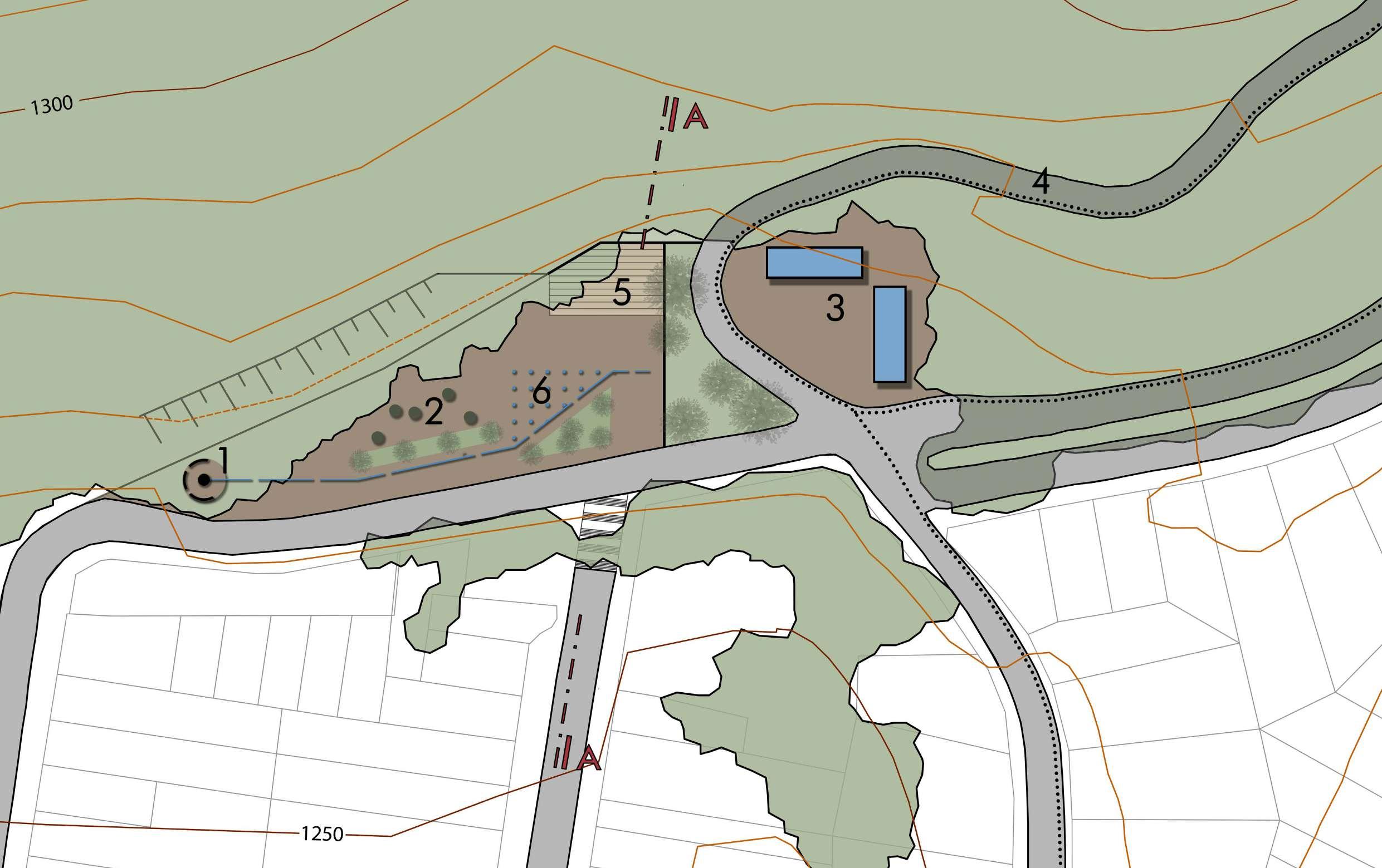 Legenda: Mapa de proposta do complexo hidrotermal na área da represa sobre base cadastral. Fonte: Caio Rodrigues Ramos, 2022. 1- Terminal de ônibus intermunicipal 2- Estação de teleférico intermediária 3- Poliesportivo (quadras) 4- Centro de treinamento de canoagem 5- Museu das Águas PROPOSTAS Institucional Caminhos e estacionamentos Linha de alta tensão Linha do teleférico EXISTENTES Equipamento existente Área verde / mata Corpo d'água 6- Auditório ao ar livre 7- Balneário 8 - Aquário 9- Restaurante da represa 10- Subestação elétrica 1 2 3 4 5 6 7 8 9 10