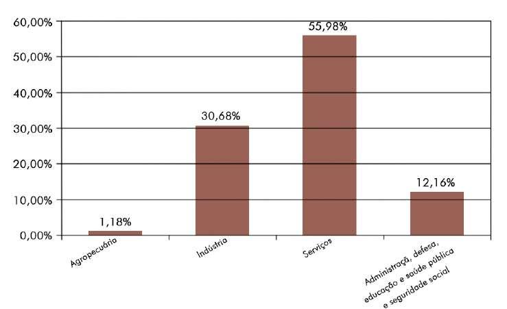 Legenda: Participação dos setores na econômia de Poços de Caldas em porcentagem. Fonte: Elaborado pela equipe. Dados: IBGE, 2010 e Estatística do Cadastro Central de Empresas 2015. OrganizaçãoOLIVEIRA, E. M., 2012.