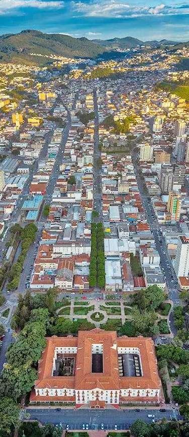 Legenda: Vista aérea a partir do eixo de crecimento do Palace Casino e Praça Dr. Pedro Sanches, marco zero de Poços de Caldas. Fonte: Prefeitura Municipal de Poços de Caldas.
