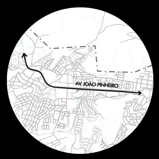 Segregação Socioespacial: Uma das primeiras problemáticas de Poços de Cal das identificadas pelo grupo. Nota-se uma malha urbana espraiada e permeada por vazios urbanos, onde há uma nítida contra posição entre um centro abastado e con solidado e as periferias que se assentaram em meio a topografia acidentada.