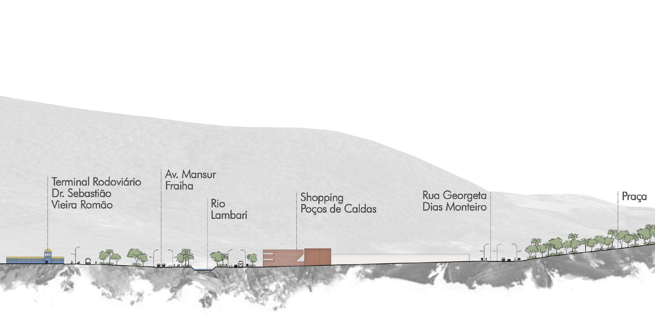 Além de sua posição, a região é privilegiada pela presença do Rio Lambari, que cruza o bair ro e produz uma cascata no meio urbano, atu almente o elemento é depreciado em meio a uma praça ocupada por um centro poliesporti vo público abandonado que dará lugar ao pro jeto.