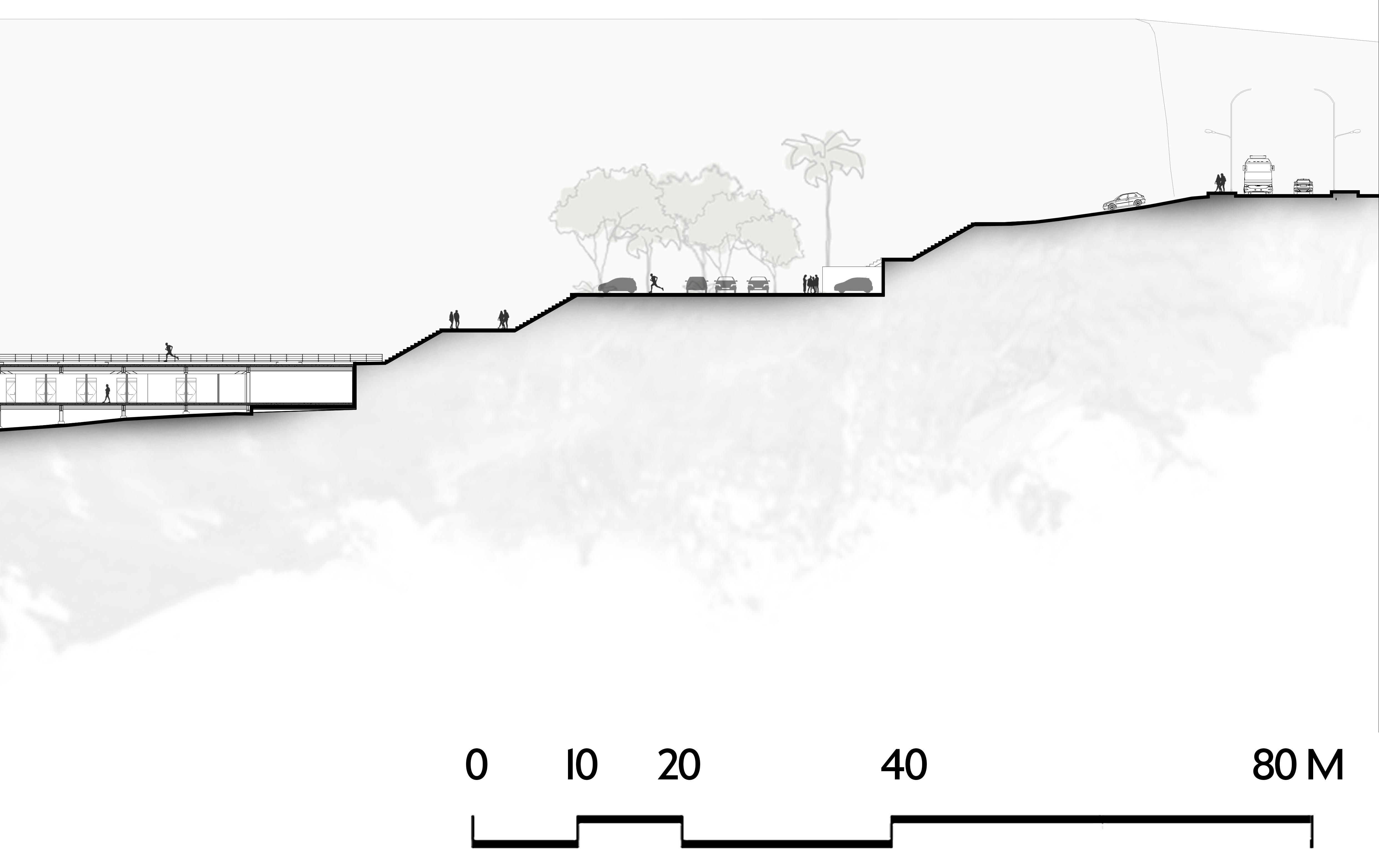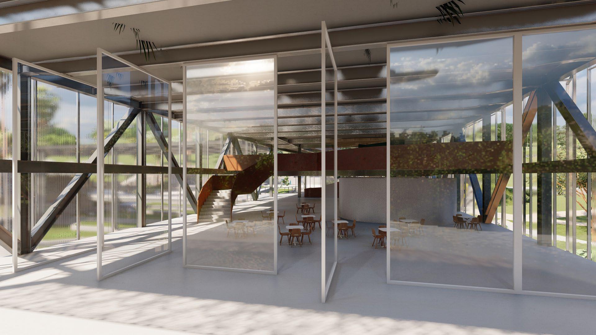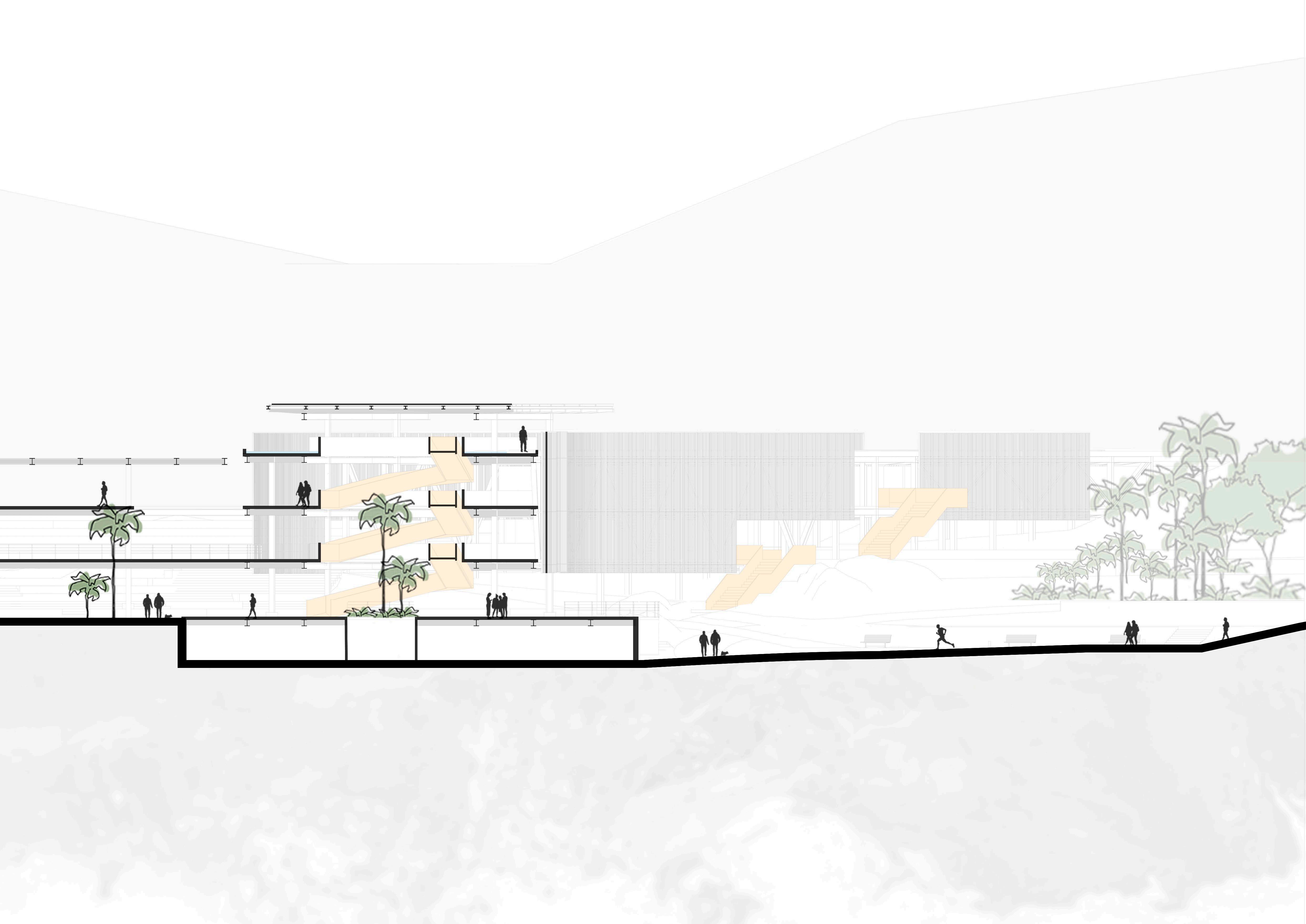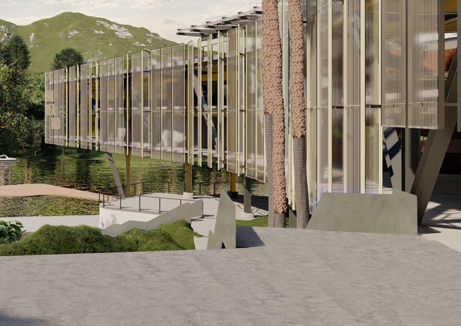 O projeto se apresenta como uma respos ta às especificidades do território, adotan do a natureza como potencializadora das diferentes perspectivas que cada curva da arquitetura pode revelar. Neste sentido, o volume laminar se contrapõe a topografia, configurando-se como uma rocha translú cida que aflora do solo, flutua sobre a água e se adequa a escala da paisagem. Visuais para o entorno são possibilitadas em seus diferentes percursos e jardins internos ga rantem que a paisagem participe da espa cialidade interna.