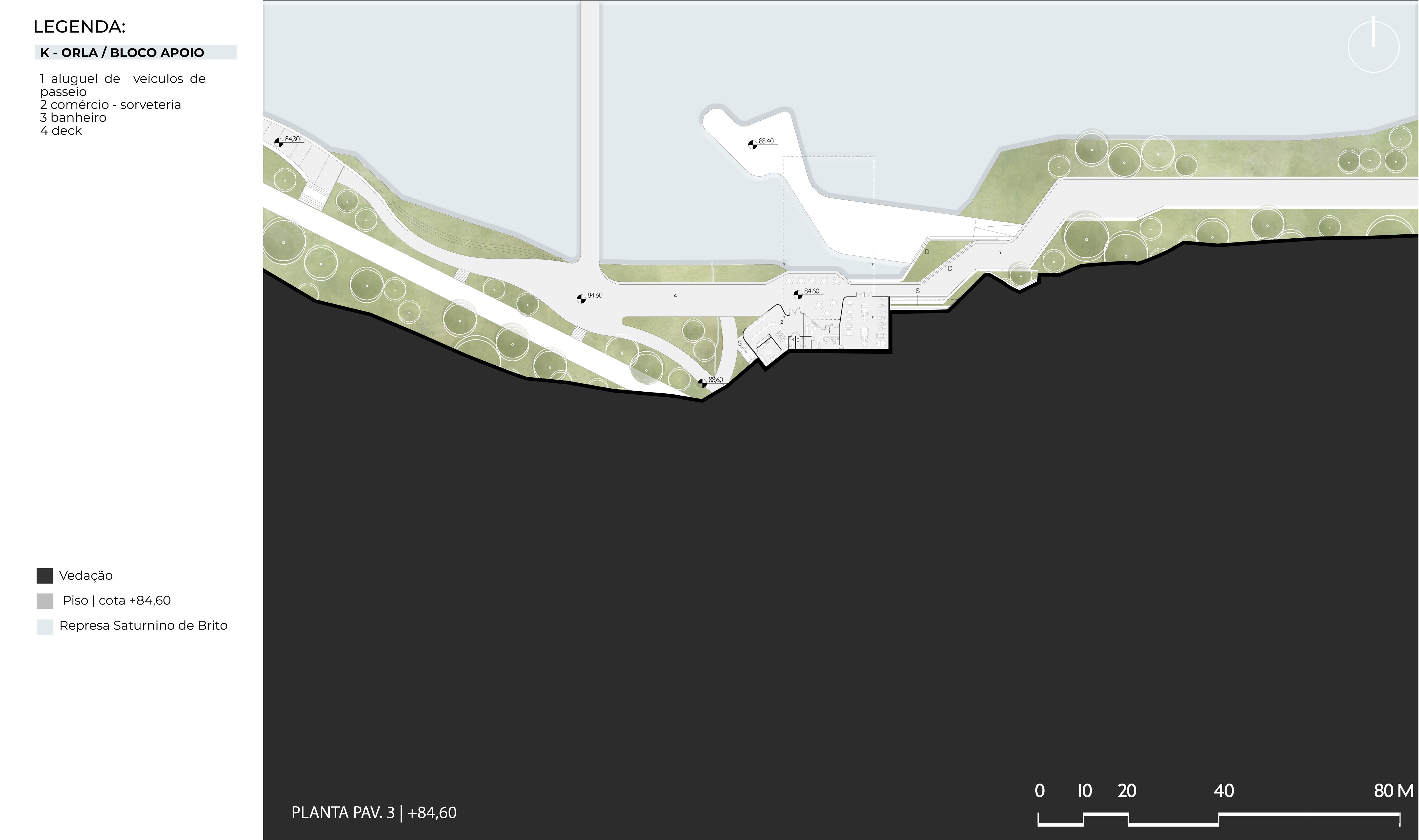 Além disso, as propostas se voltam para dois outros pontos que serão im portantes para entender a partir desse momento a dinâmica e a proposta de projeto arquitetônico desenvolvida para a área objeto desse estudo, a Represa Saturnino de Brito, sendo eles, a despolarização da área central, buscando criar novos núcleos de desenvolvimento cultural, educacional, turístico e paisa gístico principalmente na região sul, associado a uma rede de equipamentos e infraestruturas públicas, de modo a diminuir a dependência das mesmas em relação ao centro da cidade. Para isso, tem como amparo ocupar uma área que faz parte do também proposto Parque Ambiental Integrado, constituído de um sistema Integrado de espaços verdes, que costura a malha urbana mais precisamente no sentido centro-periferia, conectando áreas ambientais estra tégicas, afim de reduzir a ocupação irregular e suas devidas consequências.