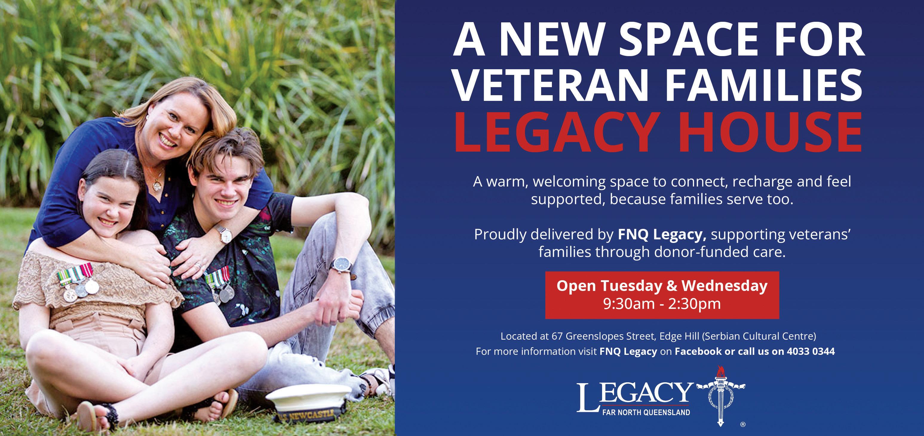 Legacy House, an FNQ Legacy initiative, will be the first purposebuilt facility in the region designed specifically to support the families of our fallen or incapacitated veterans’ widows, children, carers and those who are often forgotten about.