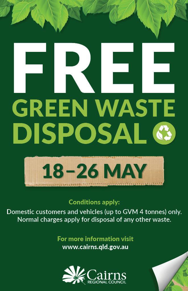 CAIRNS Regional Council’s next free green waste disposal period of the year starts this weekend. Residential green waste can be dropped off freeof-charge from May 18-26 at the Portsmith, Smithfield, Gordonvale, and Babinda Transfer Stations, seven days a week, from 8.30am to 5.15pm. People are encouraged to make a voluntary gold coin donation for the Far North Queensland Youth Assistance Fund.