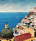 This colourful painting depicts Positano, a cliffside village in southern Italy’s Amalfi Coast and a well-known holiday destination with a pebble beachfront and steep, narrow streets lined with boutiques and cafes.