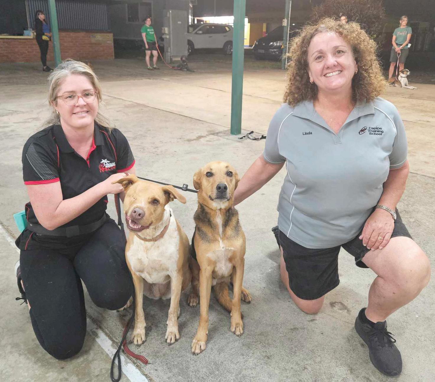 NQAR volunteer Tina Beckham and Canine Training School founder Linda Mair with rescue dogs Odie and Digit. Picture: Supplied