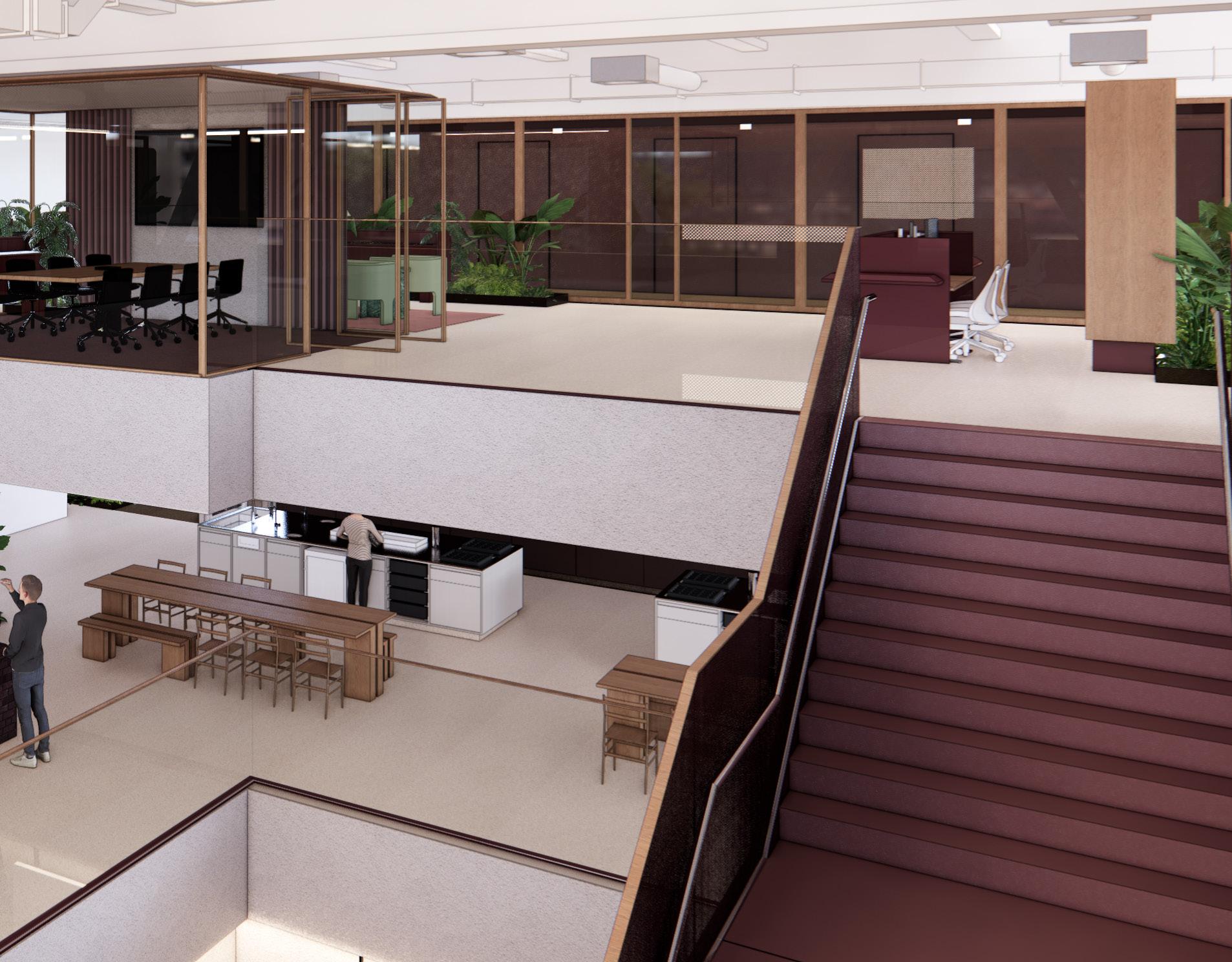 This Brisbane workplace for a major Bank has a conceptual direction to create a space that feels uniquely Brisbane, drawing on the local spirit and vernacular whilst celebrating the unique base building form and elements. Influenced by the spirit and identity of place, a refined palette of sustainability conscious materials has been developed. Timbers, green accents and pops of maroon from the rich Brisbane sunsets encapsulates a sophisticated design to create an authentic Brisbane experience for client.