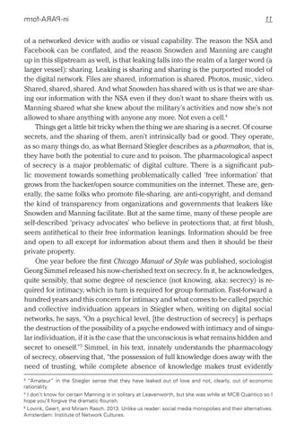 of a networked device with audio or visual capability. The reason the NSA and Facebook can be conflated, and the reason Snowden and Manning are caught up in this slipstream as well, is that leaking falls into the realm of a larger word (a larger vessel): sharing. Leaking is sharing and sharing is the purported model of the digital network. Files are shared, information is shared. Photos, music, video. Shared, shared, shared. And what Snowden has shared with us is that we are sharing our information with the NSA even if they don’t want to share theirs with us. Manning shared what she knew about the military’s activities and now she’s not allowed to share anything with anyone any more. Not even a cell.4 Things get a little bit tricky when the thing we are sharing is a secret. Of course secrets, and the sharing of them, aren’t intrinsically bad or good. They operate, as so many things do, as what Bernard Stiegler describes as a pharmakon, that is, they have both the potential to cure and to poison. The pharmacological aspect of secrecy is a major problematic of digital culture. There is a significant public movement towards something problematically called ‘free information’ that grows from the hacker/open source communities on the internet. These are, generally, the same folks who promote file-sharing, are anti-copyright, and demand the kind of transparency from organizations and governments that leakers like Snowden and Manning facilitate. But at the same time, many of these people are self-described ‘privacy advocates’ who believe in protections that, at first blush, seem antithetical to their free information leanings. Information should be free and open to all except for information about them and then it should be their private property. One year before the first Chicago Manual of Style was published, sociologist Georg Simmel released his now-cherished text on secrecy. In it, he acknowledges, quite sensibly, that some degree of nescience (not knowing, aka: secrecy) is required for intimacy, which in turn is required for group formation. Fast-forward a hundred years and this concern for intimacy and what comes to be called psychic and collective individuation appears in Stiegler when, writing on digital social networks, he says, “On a psychical level, [the destruction of secrecy] is perhaps the destruction of the possibility of a psyche endowed with intimacy and of singular individuation, if it is the case that the unconscious is what remains hidden and secret to oneself.”5 Simmel, in his text, innately understands the pharmacology of secrecy, observing that, “the possession of full knowledge does away with the need of trusting, while complete absence of knowledge makes trust evidently “Amateur” in the Stiegler sense that they have leaked out of love and not, clearly, out of economic rationality. 3