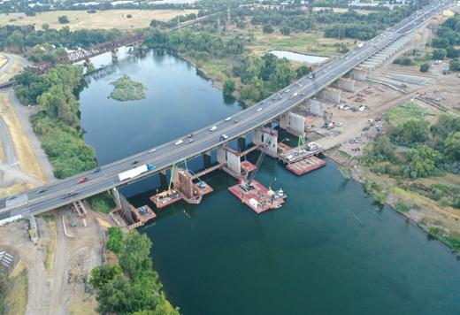 The joint venture is widening the bridge to 150 feet to accommodate three lanes in each direction with compliant shoulders, while adding a Class 1 bike and pedestrian path that connects downtown Sacramento to existing bike routes. The superstructure was widened first to maintain full traffic capacity during deck replacement.
