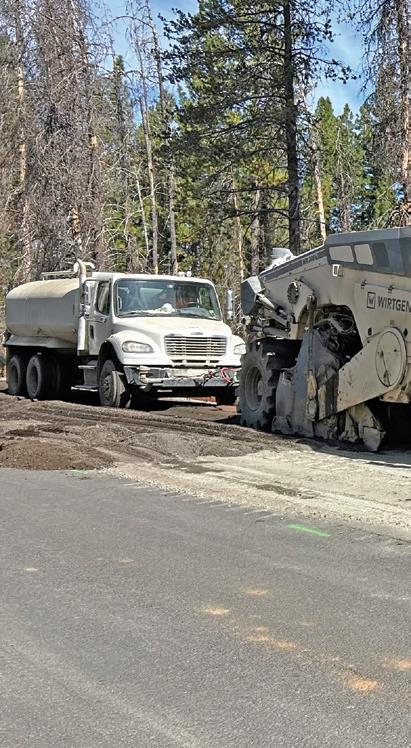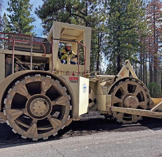consisting of an oil truck, water truck, and reclaimer, followed by compactors and graders. Once the base cured, crews placed approximately 4.5 inches of new asphalt concrete (AC) in two lifts, totaling more than 85,000 tons of new asphalt material.
