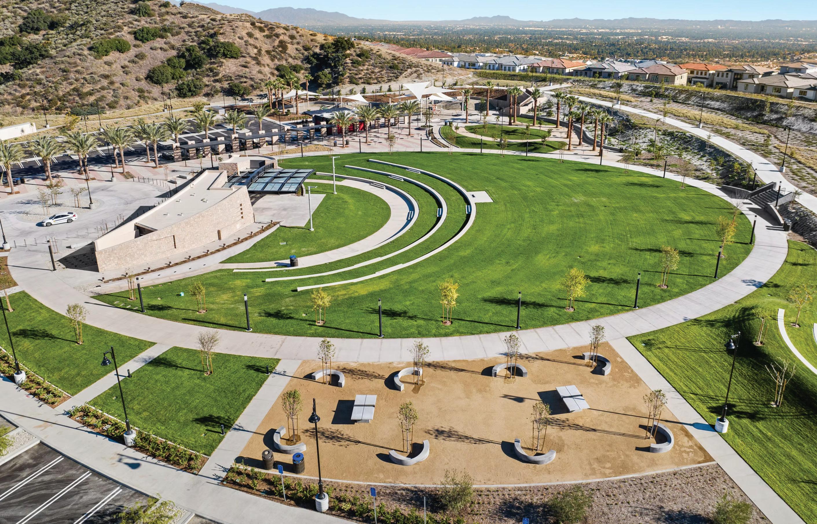 En el Parque Jane y Bert Boeckmann de Porter Ranch, un desarrollo comunitario planificado de 50 acres en el Condado de Los Ángeles, Oakridge se encargó de todo el alcance de la construcción paisajística y del sitio. El trabajo incluyó pavimento decorativo, canchas de baloncesto y pickleball, edificios de servicios, construcción de anfiteatro, iluminación y trabajos de concreto. “Este proyecto tardó alrededor de dos años en