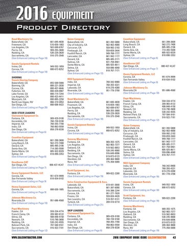 Volvo Construction Equipment & Svcs. Lakeside, CA 619-441-3690 Bakersfield, CA 661-387-6090 Sacramento, CA 916-388-2244 Corona, CA 951-277-7620 Fresno, CA 559-834-4420 San Leandro, CA 510-357-9131 Turlock, CA 209-410-6710 (See Enhanced Listing on Page 21) SKIP LOADERS Clairemont Equipment Co. Fontana, CA Escondido, CA lmperial, CA Indio, CA San Diego, CA (See Enhanced Listing on Page 6)