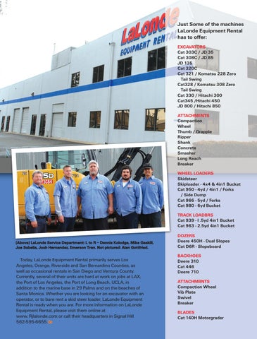 Today, LaLonde Equipment Rental primarily serves Los Angeles, Orange, Riverside and San Bernardino Counties, as well as occasional rentals in San Diego and Ventura County. Currently, several of their units are hard at work on jobs at LAX, the Port of Los Angeles, the Port of Long Beach, UCLA, in addition to the marine base in 29 Palms and on the beaches of Santa Monica. Whether you are looking for an excavator with an operator, or to bare rent a skid steer loader, LaLonde Equipment Rental is ready when you are. For more information on LaLonde Equipment Rental, please visit them online at www. Rjlalonde.com or call their headquarters in Signal Hill 562-595-6655. Cc