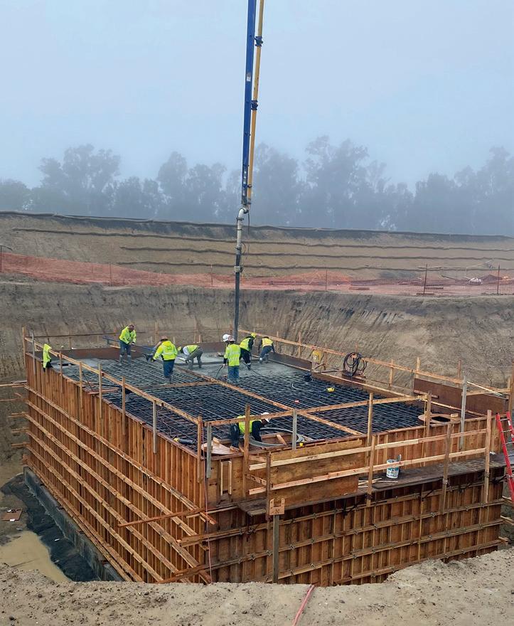 “Once the seasonal pond and levee were excavated and constructed, we came in with our subcontractor, Barber Webb Co., who then installed HDPE liner throughout the pond. After this, we were able to then tap into it with a 18-inch overflow pipe,” says Sweet. “The next job at hand was to excavate and construct a recycled pump station and UG emergency storage tank to help manage the wastewater and keep the plant running efficiently. According to Sweet, the construction of the 18-foot-tall by 24-footwide reclaimed water structure required his crews to dig into the side of the levee and excavate down around 30 feet.