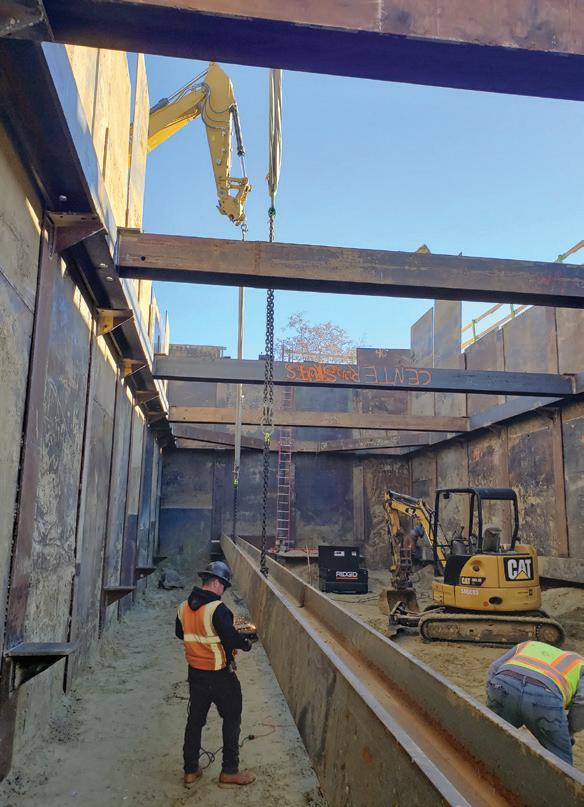Above: LB Civil crew installing one of the massive W14x233 whalers while also welding it to chairs for support.where the existing storm drains were running so that we could plot out the new alignment of the new sections. This process required extensive potholing to depths as far down as 50 feet. The existing storm drains are not straight and have several radius’ and those had to be located. We officially began construction in April 2022 and hope to be finished by July 2023.”