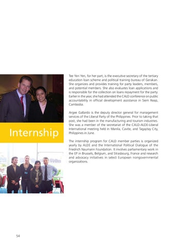 Argee Gallardo is the deputy director general for management services of the Liberal Party of the Philippines. Prior to taking that post, she had been in the manufacturing and tourism industries. She was a member of the secretariat of the CALD-ALDE-Liberal International meeting held in Manila, Cavite, and Tagaytay City, Philippines in June. The internship program for CALD member parties is organized yearly by ALDE and the International Political Dialogue of the Friedrich Naumann Foundation. It involves parliamentary work in the EP in Brussels, Belgium, and Strasbourg, France and research and advocacy initiatives in select European nongovernmental organizations.