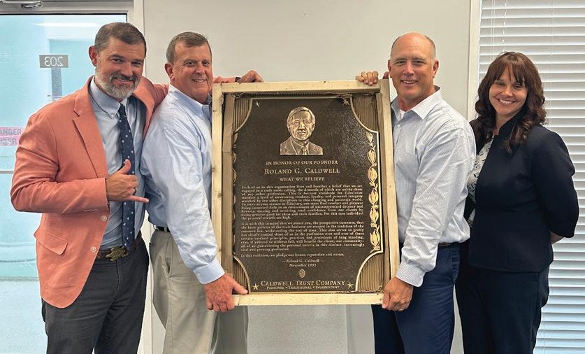 R.G. “Kelly” Caldwell joins David L. Osgood, AWMA®, Jamie Bryan, and Rebecca Lachance in displaying the company’s “What We Believe” bronze sculpture. Soon to be affixed to the new Vero Beach office, the piece symbolizes Caldwell Trust Company’s core values and enduring commitment to its founding principles.