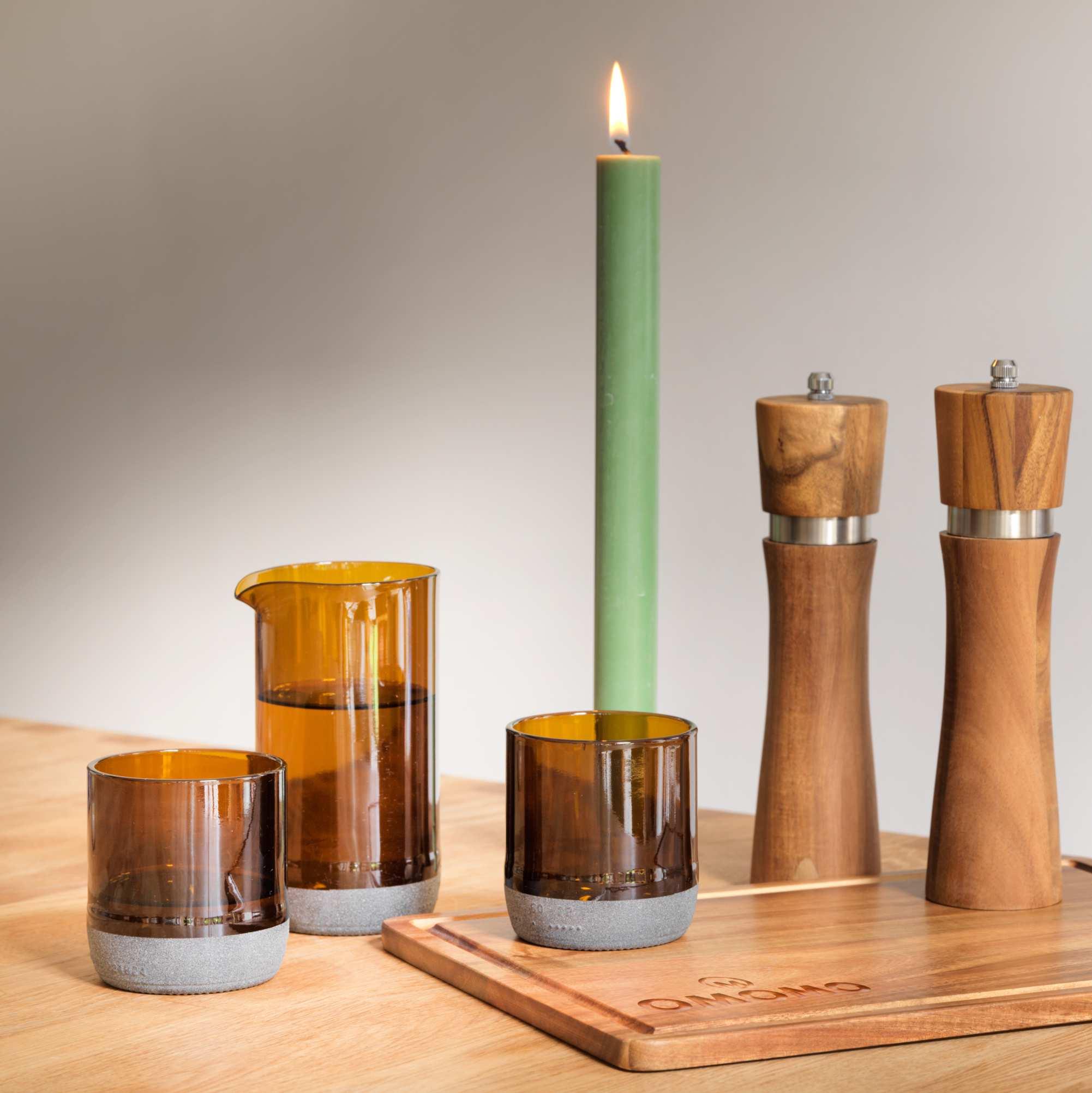 Candles are made from palm kernel wax. They are 100% natural, vegan-approved, unscented, and have a clean burn. This means that these candles emit less CO2 compared to a paraffin candle. Palm kernel wax is the most sustainable wax as it doesn’t contain any chemical, synthetic, or animal-based reagents and the palm is a highly efficient crop. The candles are poured by hand in a small factory in Java, Indonesia.