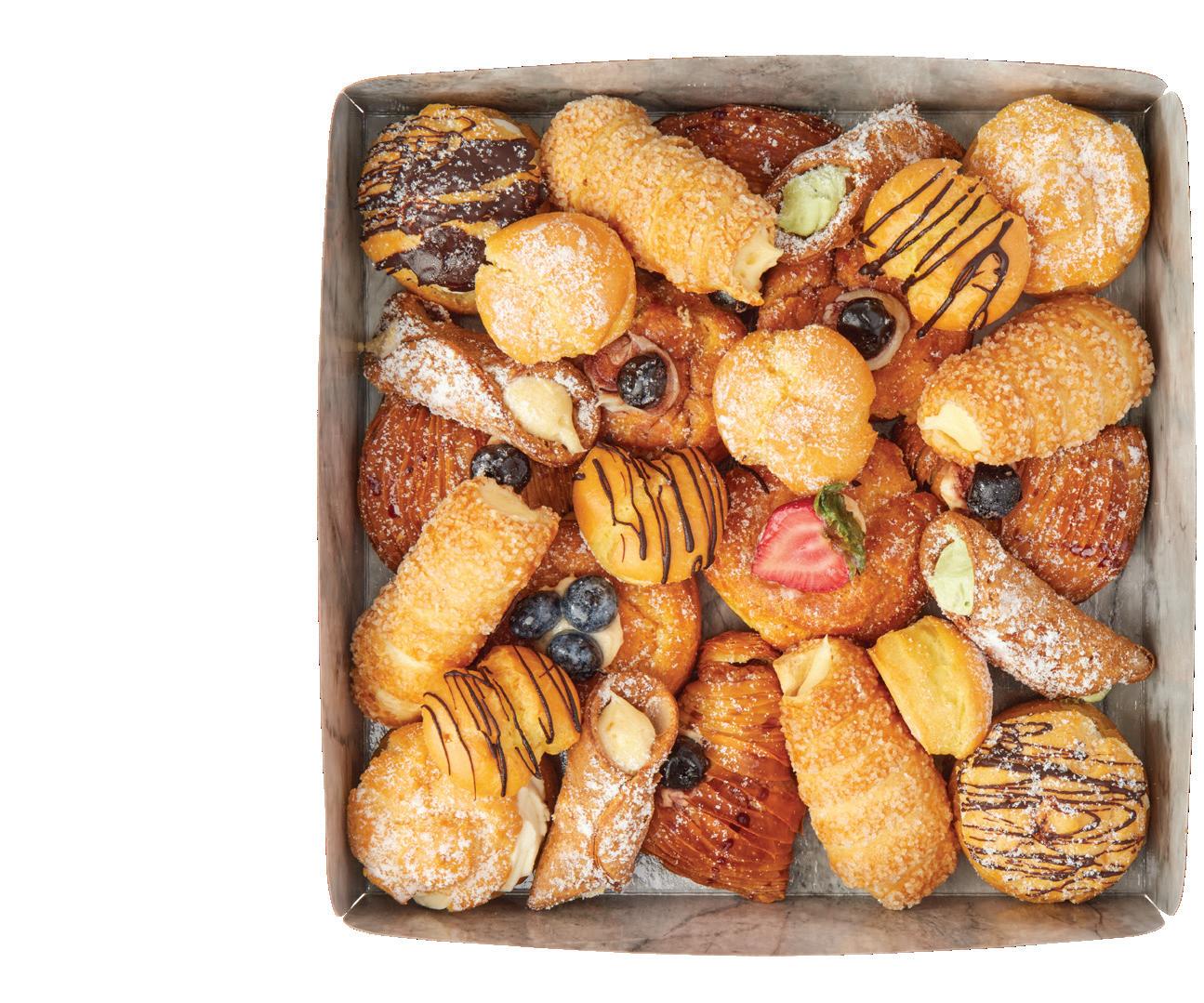 Experience decadence with our assortment of indulgent treats. Profiteroles filled with a lucious cream, flaky lobster tails and zeppole pastries filled with chantilly ceam topped with Amarena cherries, traditional crisp cannoli shells filled with ricotta or ricotta chocolate chip filling. Each pastry showcases our dedication to quality offering an unforgettable experience in every bite.