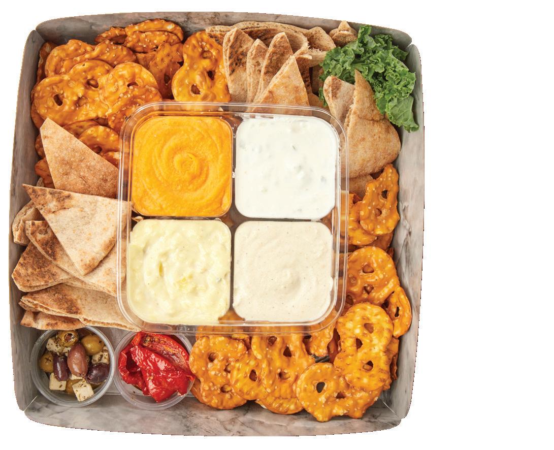 Dive into a Mediterranean medley featuring tzatziki, baba ganouj, roasted red pepper hummus, and artichoke & asiago dips. These delectable dips are perfectly paired with crunchy pretzel crisps and pita wedges, adorned with the vibrant garnish of roasted red tomatoes and an olive/feta mix. Experience a taste of the Mediterranean like never before!