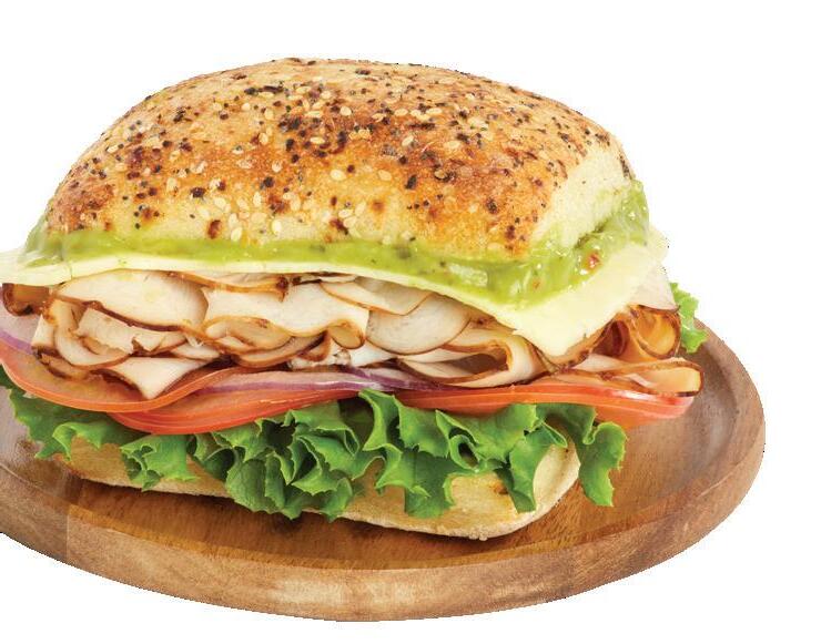California Dreaming: Oven roasted turkey breast, creamy havarti, mayo, leaf lettuce, tomato, red onion and guacamole is sandwiched on a mouth watering Cal & Gary's Everything Ciabatta bun. Try it heated!