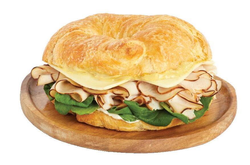 Turkey & Havarti Croissant: Thinly sliced turkey breast, creamy havarti, mayo, Dijon mustard and arugula are perfectly paired on a freshly baked in-store croissant.