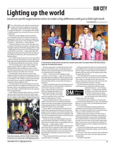 rom a little white house nestled amongst the skyscrapers of downtown Calgary, local non-profit organization, Light Up The World, is attempting to conquer a hefty goal — to bring light to the roughly 1.4 billion people across the world who have no access to electricity. Working in remote villages in over 50 countries across the globe, Light Up The World and its partner organizations work with communities to implement a sustainable energy system using LED lights to brighten the homes, — and the lives — of local families. “Energy and light are a basic service, like water, that is integral in the daily lives of people,” said Ada Yee, the manager of Light Up The World’s regional office in Peru. Bright light now bursts from the 27,000 homes Light Up The World has touched — replacing the flickering candlelight and kerosene lamps that many families use in the absence of electricity, with solar-powered LED lighting systems. Just a simple change has proven to have huge effects on the community: boosting the economy, allowing for better educational opportunities and improving health — all while doing right by the environment, Yee said. “The technology exists to give a better quality and higher quantity of light in a safe, environmentally friendly, efficient and cost-effective manner to countries that may possibly never have access to the type of electricity that we are familiar with,” Yee said. The organization got its start when Dave IrvineHalliday, a professor of electrical engineering at the University of Calgary, stumbled across a dimly lit classroom in rural Nepal in 1997. Children could be seen hunched over books trying to study by candlelight, their eyes squinting as they struggled to read. “The issue that he was trying to address was not the fact that they didn’t have light, but that they were using kerosene, which is very polluting and still doesn’t produce a lot of light,” said Christoph Schultz, the organization’s program director. Irvine-Halliday had heard about advances in technology that made it possible for LEDs to be used for general illumination instead of just indicator lights and saw this as a solution to the children’s problem, Schultz said.