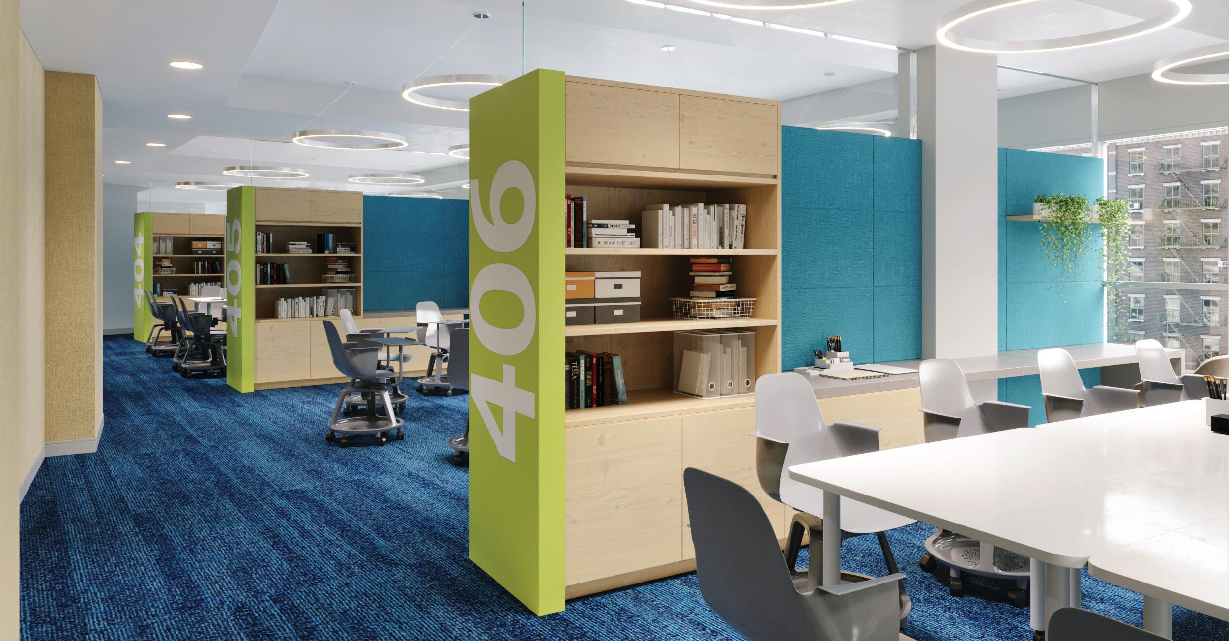 Preliminary visions for new Upper School classroom spaces in Calhoun’s 81st Street building. On the fourth fl oor, the locker area by the elevator will be transformed into a student lounge. While we are retaining our open fl oor plan, our teachers will gain more control over lighting, acoustics and furniture layout in classroom areas. On the seventh fl oor, we will create a third US laboratory, re-equip all the labs, and redesign the central classroom area.
