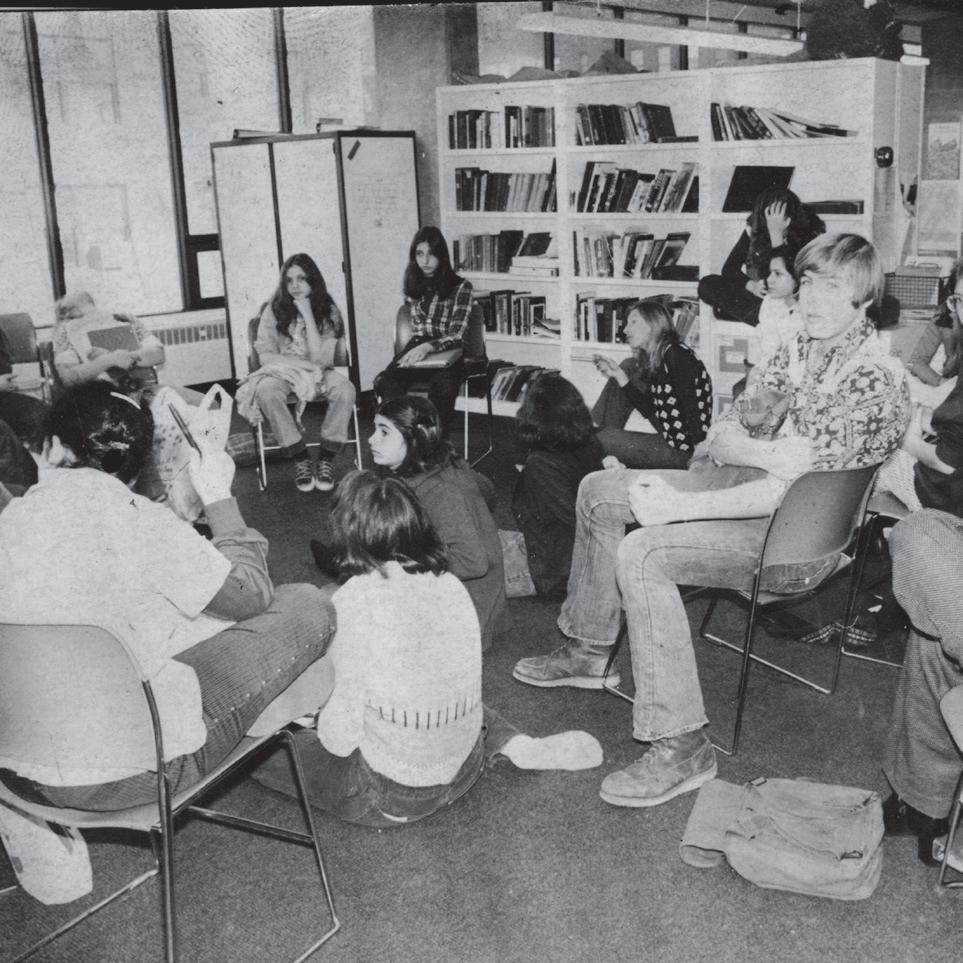 (Opposite and above) The open-space layout of the 81st Street building fostered lively classroom discussions and close student-teacher relationships. (Below) The last all-girls’ class graduated from Calhoun in 1975.