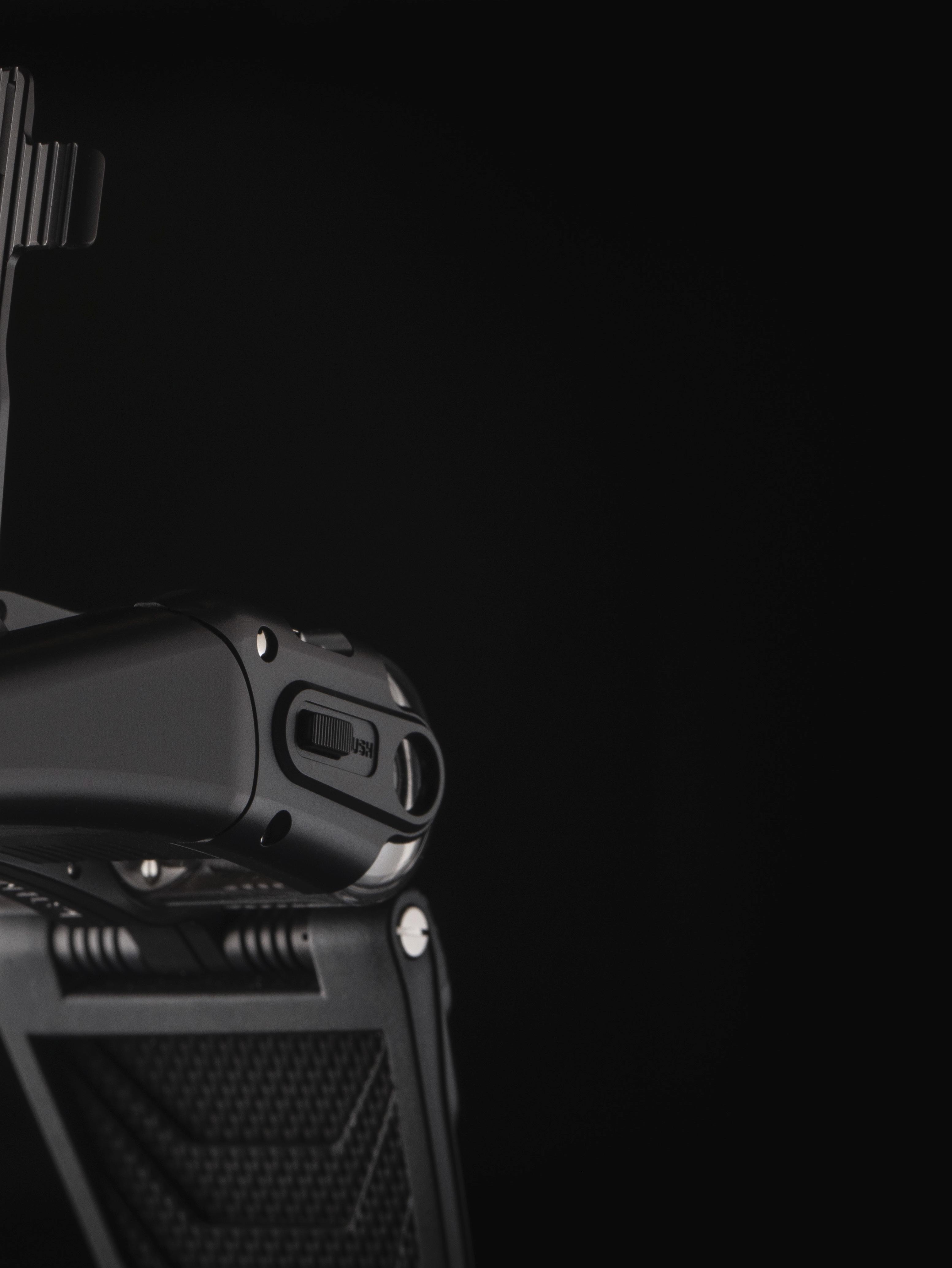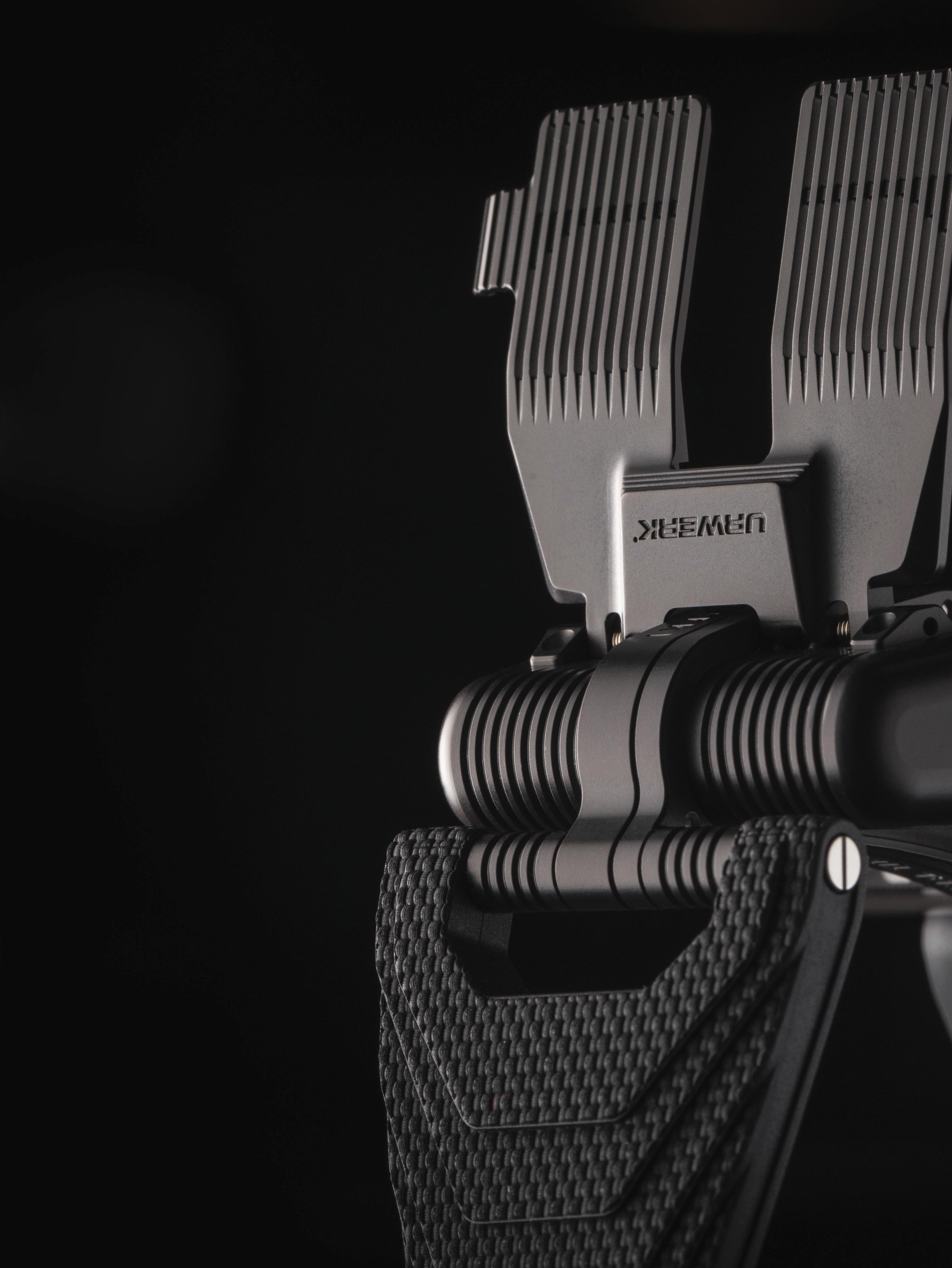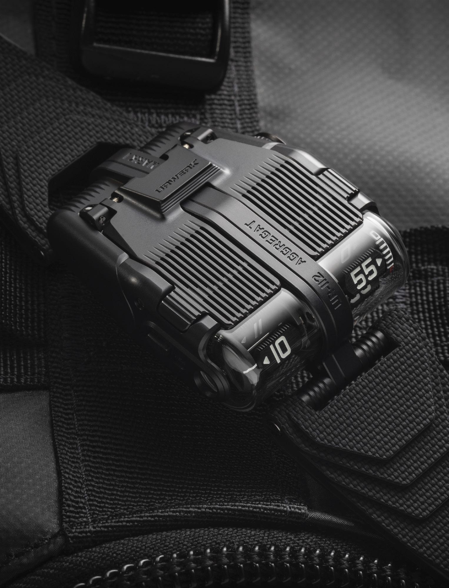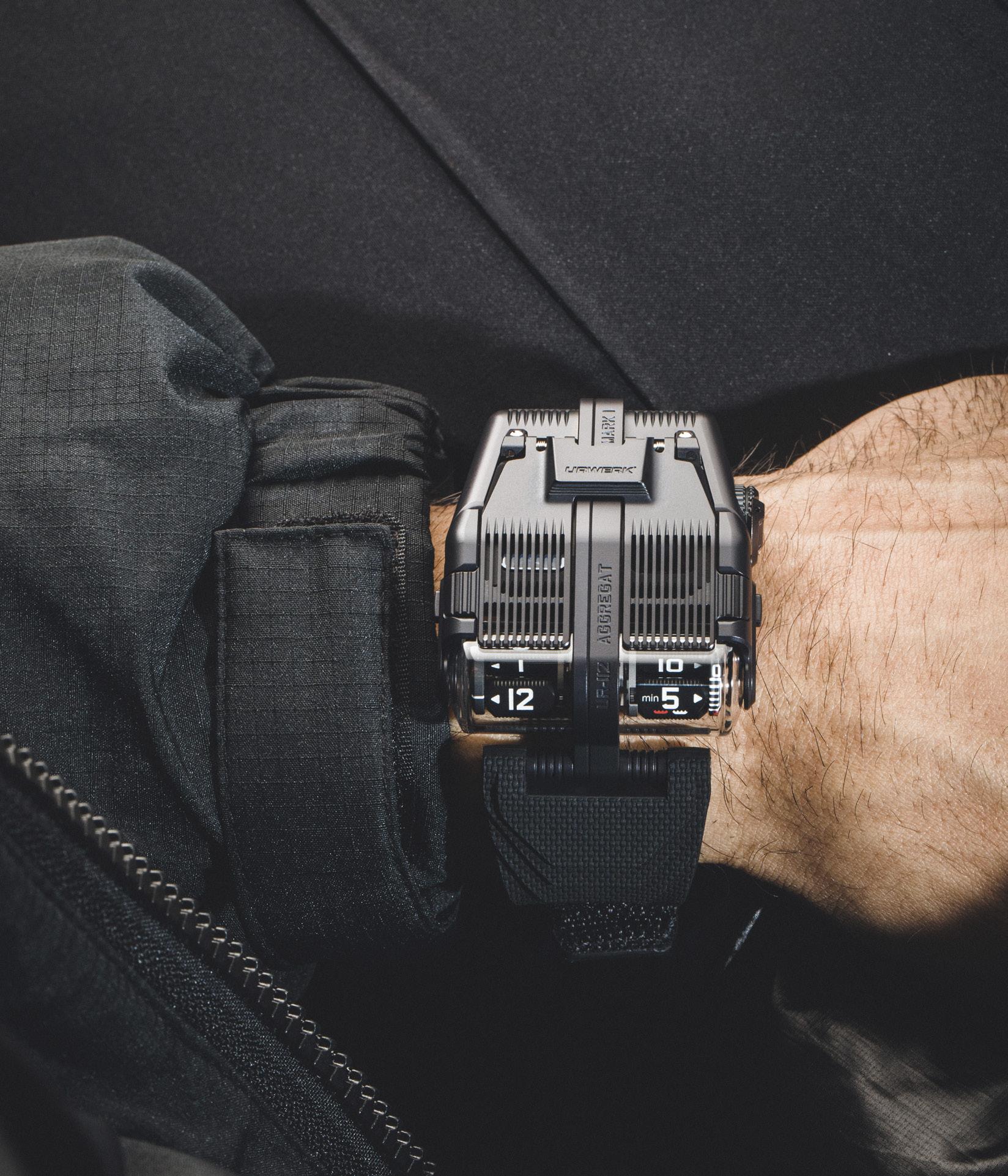 Its central titanium body is satin-brushed, sandblasted and beadblasted, thereby forming a field of functional microdots. The two blackened steel wings of the UR-112 Aggregat Back to black fit into this central body, which, viewed on the wrist, tapers from front to back, and features the central seam on the “caseback” where it transforms into the floating lugs as it reaches the extremities on both sides of the case.