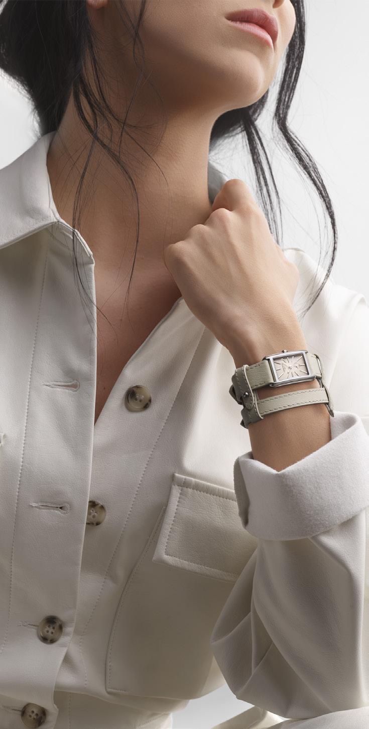 The Longines DolceVita X YVY watch has a rectangular stainless steel case with a leather strap, either single or double. The watch has touches of the equestrian influence. “We wanted to develop a new approach together to the world of horses and their bridles,” explains Yvonne Reichmuth. The bond between a rider and their mount is close, tight, but not prohibitive. Reichmuth adds, “The idea of a modular strap came about with the aim of creating a watch that could be worn with class in different styles.”