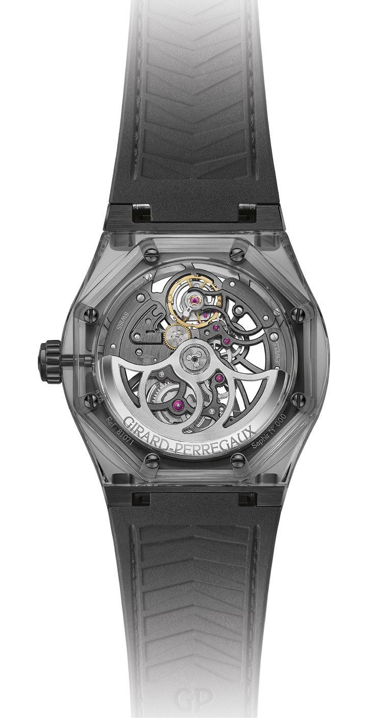 Seen from the sapphire caseback is the selfwinding AL-525 calibre, a Sellita SW200-1-based movement that oscillates at 28,800 VPH, and features a blackened rotor that generates a powerreserve of approximately 38 hours. Last but not least, is an integrated black rubber strap, the texture and tough construction of which is not only a perfect match for the dial, but is the perfect complement to a watch made for extreme sports.
