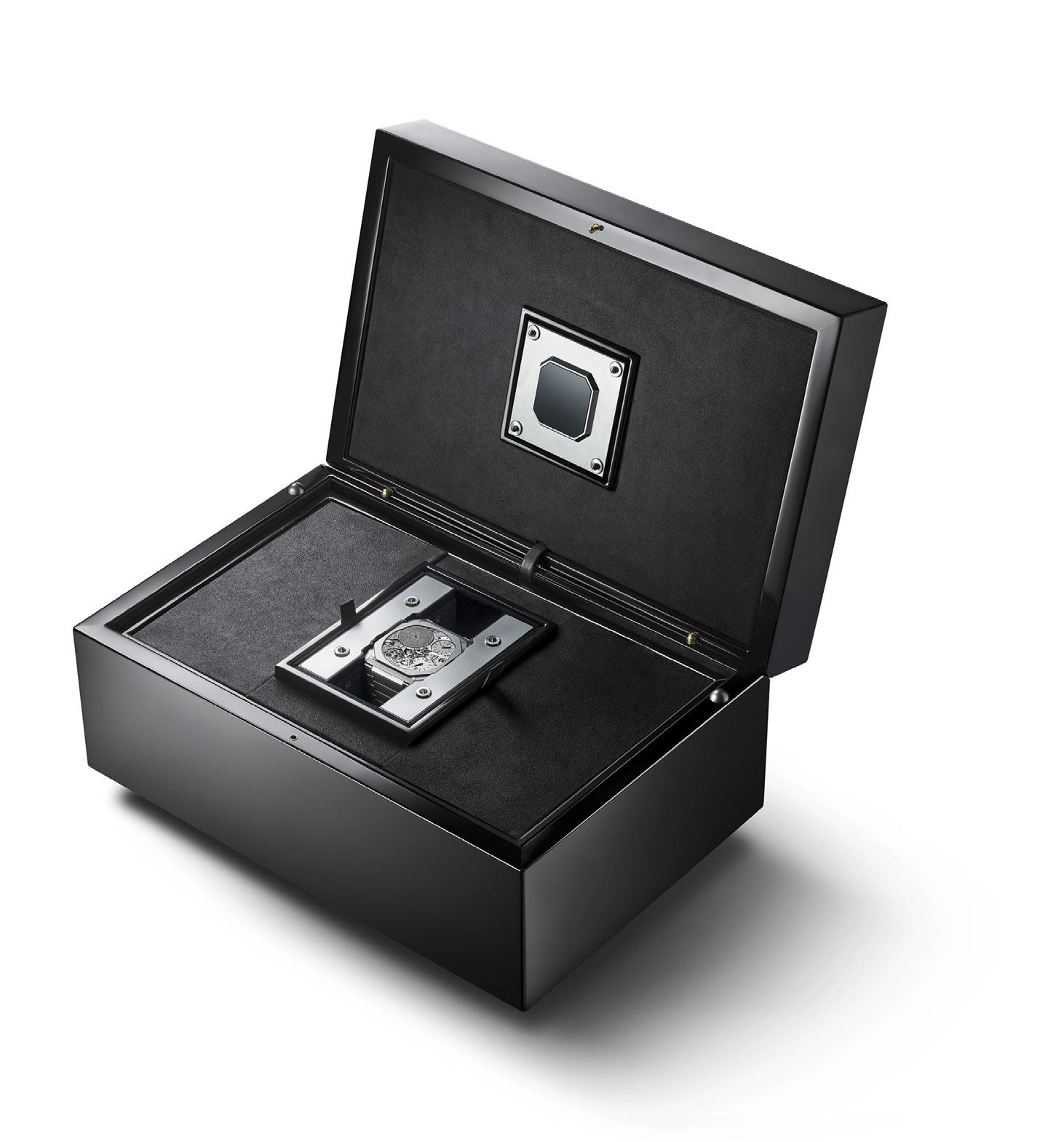 This year, the Aggregat is back for its final curtain call and this time in blacked out steel and titanium for the hunter case and central body respectively. And just like the original model, the new UR-112 Aggregat Back to Black hints at its gleaming engine within with a grooved and openworked steel bonnet, which once again opens vertically to gain access to the power reserve and digital seconds indications.