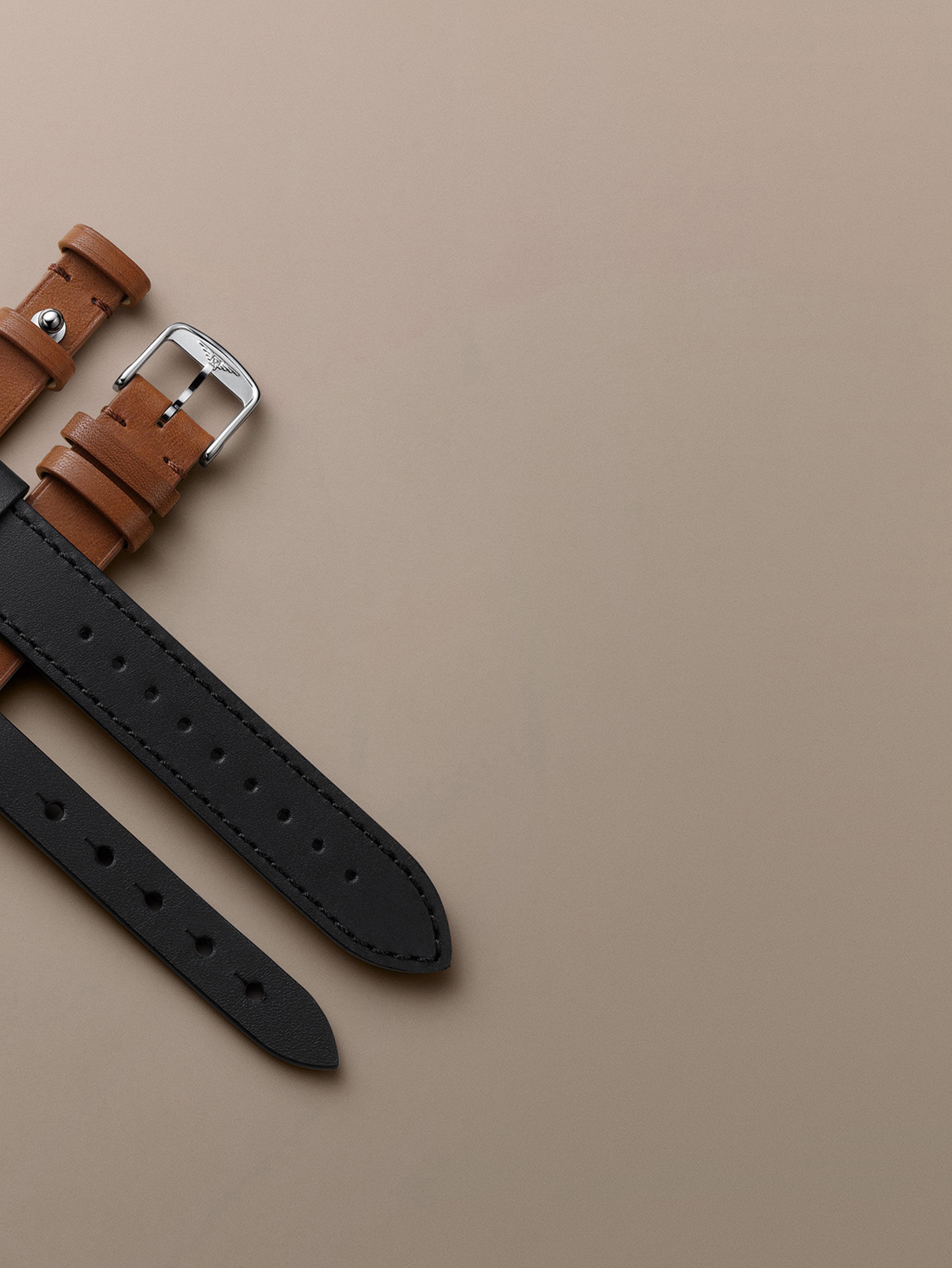 The beige model (reference no. L5.512.4.79.2) is the most sedate and understated of the three. The dial is also light in color, and a suited match for the leather straps. The hours are marked by