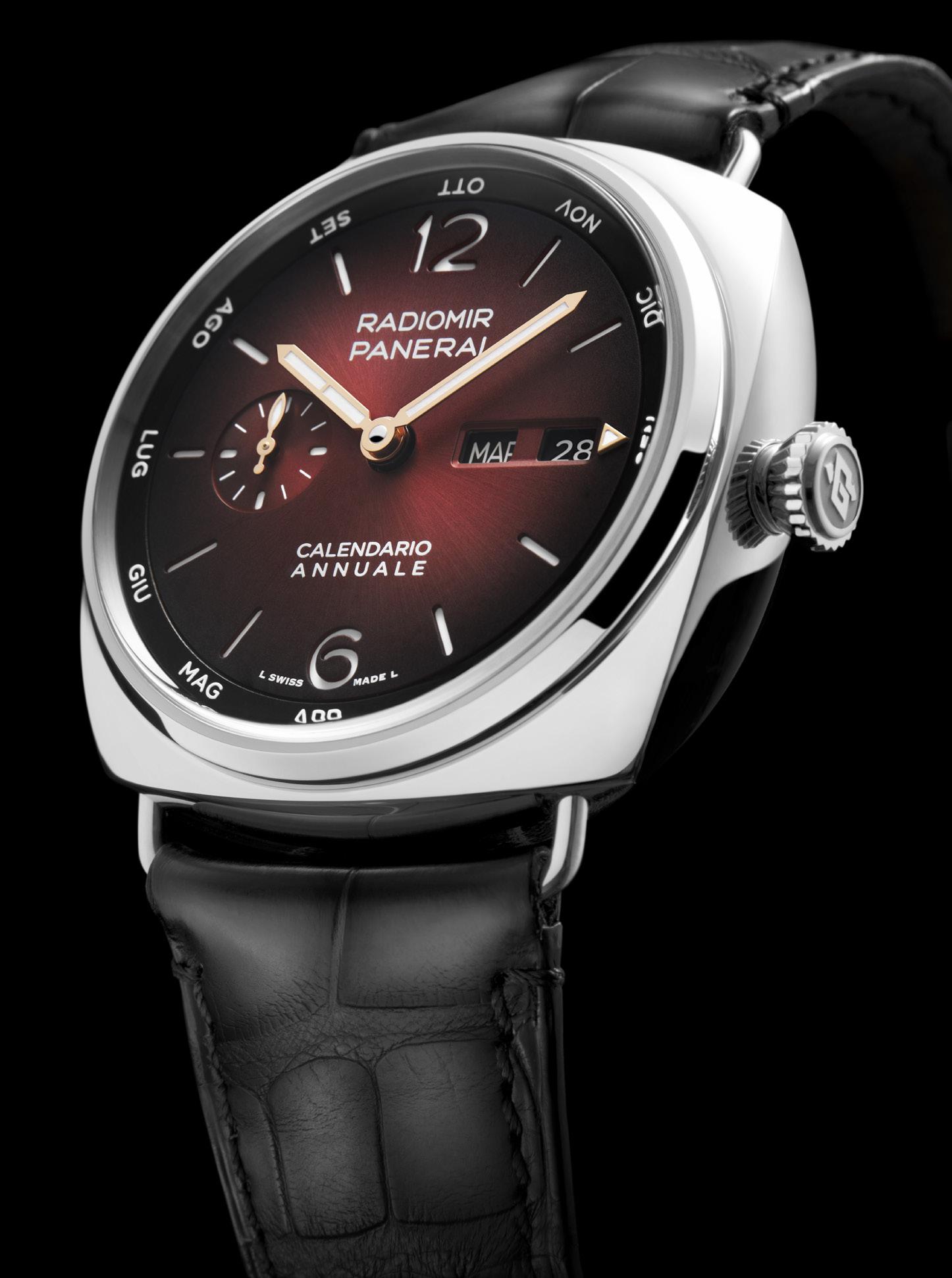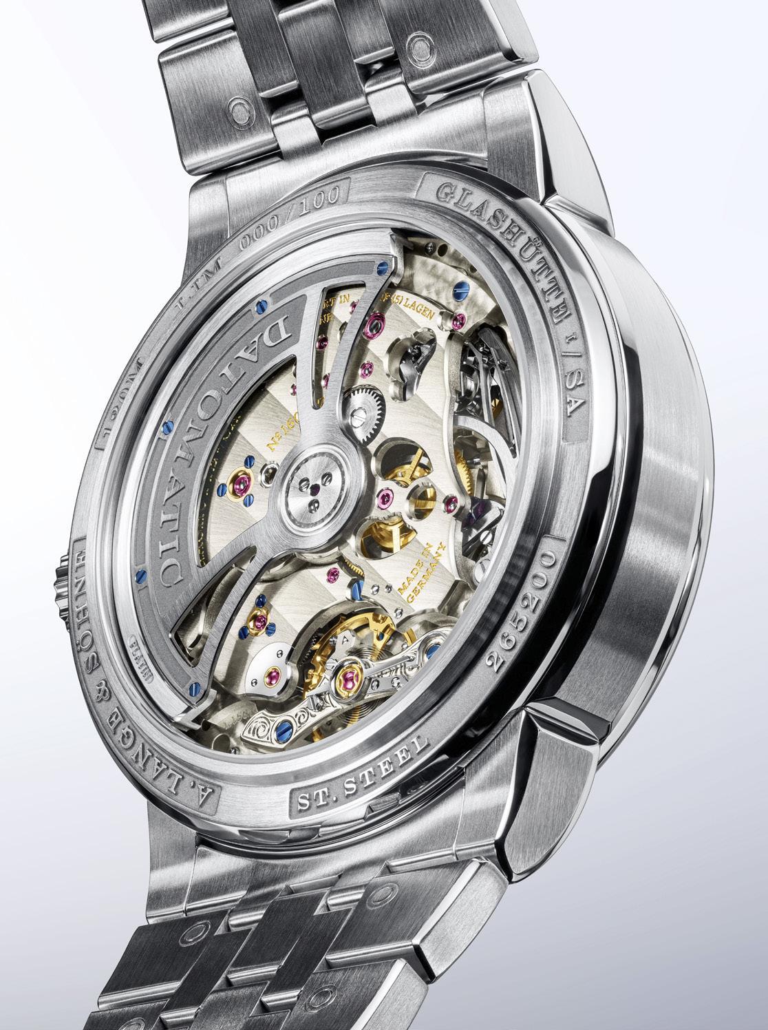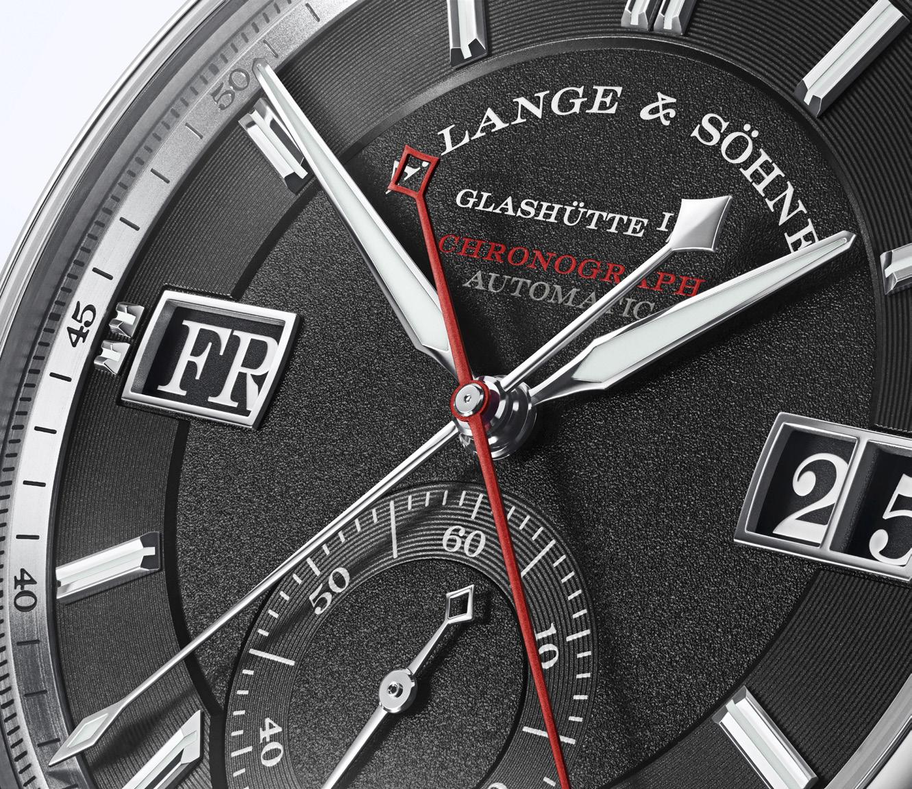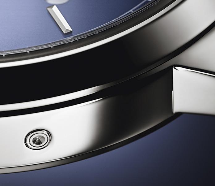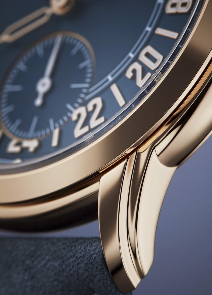 retrograde date display resides. This is enhanced by an upper part flourished with vertical hand brushing, its surface smoothed out with a dedicated abrasive to create subtle light effects.