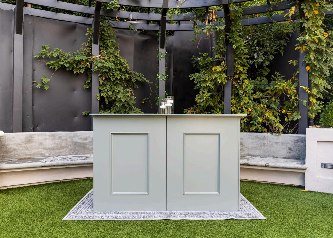 Back bar shelving; Back bar table & linen; Hedges (to separate back of house); Lighting (atmospheric string lighting with wooden poles to surround bar and back of house area); 42" round cocktail table (for self-service spa water); All bar tools - shakers, tins, spoons, muddlers, jiggers, strainers etc; Trash cans, (recycling and regular) - for bar area only; Buckets & strainers; Chilling tubs; Floor mats.