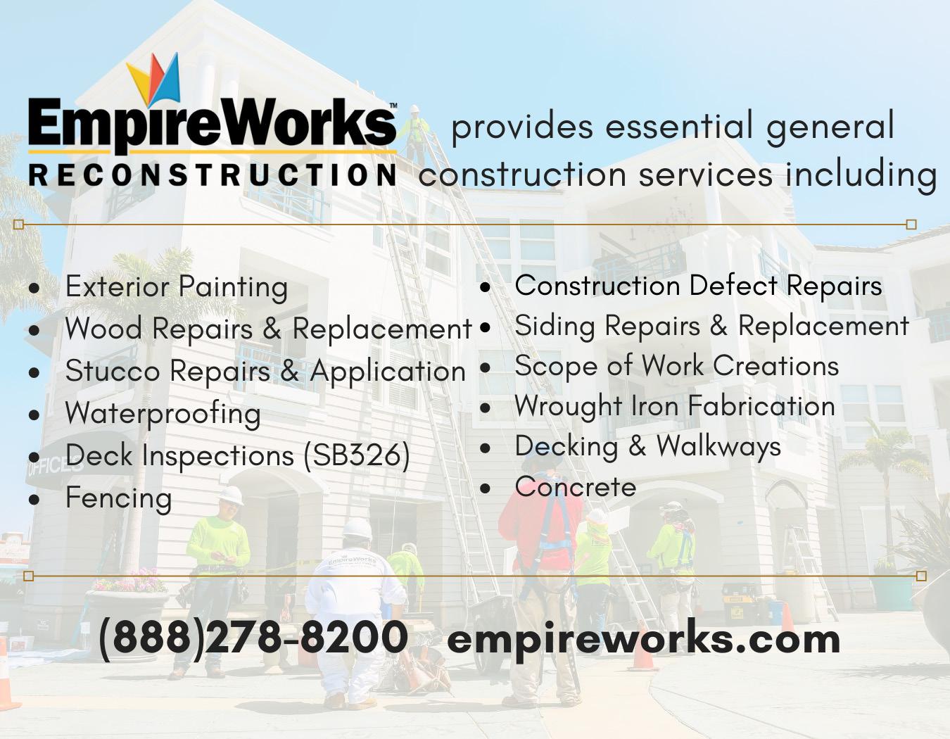 INDUSTRY PARTNERS cacm.org | 285 Velocity Construction Services, Inc. Michael Nielsen 4123 Pestana Pl Fremont, CA 94538 (510) 657-6432 www.velocitycsinc.commichael@velocitycsinc.com Also see: Dry Rot Repairs & Replacement, General Contractors, Maintenance & Repairs SIDING PRODUCTS & SERVICES Advanced Painting & Wood Repair Gerry Soneff 27075 Cabot Rd Ste 105 Laguna Hills, CA 92653 (800) 651-6516 www.advpainting.netinfo@advpainting.net Also see: Decking Products & Services, General Contractors, Painting Contractors Please see our ad on page 257 EmpireWorks Reconstruction Aaron Bovberg 1682 Langley Ave Fl 2 Irvine, CA 92614 (888) 278-8200 www.empireworks.comabovberg@empireworks.com Also see: Decking Products & Services, Dry Rot Repairs & Replacement, General Contractors, Maintenance & Repairs, Painting Contractors, Waterproofing Please see our ad on page 233 SEISMIC RETROFITTING, CONT. CACM Law Seminars Held in both Northern and Southern California, CACM’s Law Seminars bring the industry best and brightest together for the largest law seminar and expo developed solely for professional community managers. Register, exhibitingsponsoringconsiderorin2023.