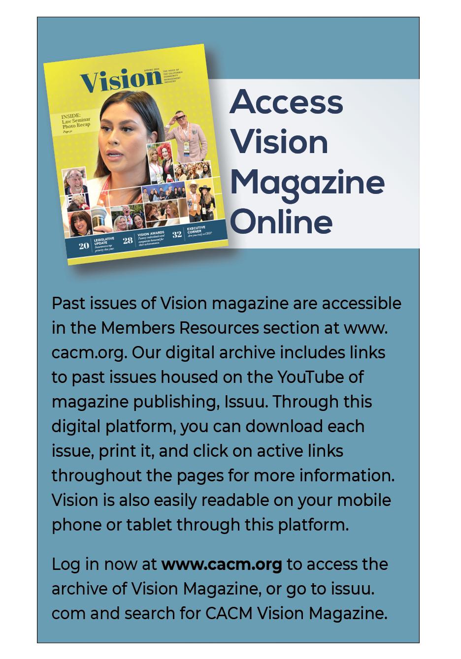 The Publications library is the perfect location for members to access California’s only state specific industry publication, Vision magazine, CACM’s quarterly publication The Law Journal, an archive of the monthly e-newsletter, myCommunity, the Education Catalog, Certification Brochure, and so much more!
