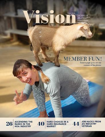 Vision FALL 2023 THE VOICE OF THE CALIFORNIA COMMUNITY MANAGEMENT INDUSTRY ASCENDING THE RANKS IN THE HOA INDUSTRY 26 40 44 HARD CHOICES IN A HARD INSURANCE MARKET JOB HACKS FROM AN INDUSTRY VETERAN MEMBER FUN! Turn to page 52 to see our summer of fun photos
