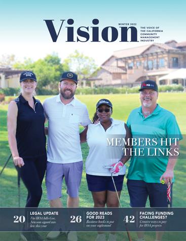 Vision WINTER 2022 THE VOICE OF THE CALIFORNIA COMMUNITY MANAGEMENT INDUSTRY LEGAL UPDATE 20 The HOA bills Gov. Newsom signed into law this year 26 Business books to put on your nightstand 42 Creative ways to pay for HOA projects GOOD READS FOR 2023 FACING FUNDING CHALLENGES? MEMBERS HIT THE LINKS