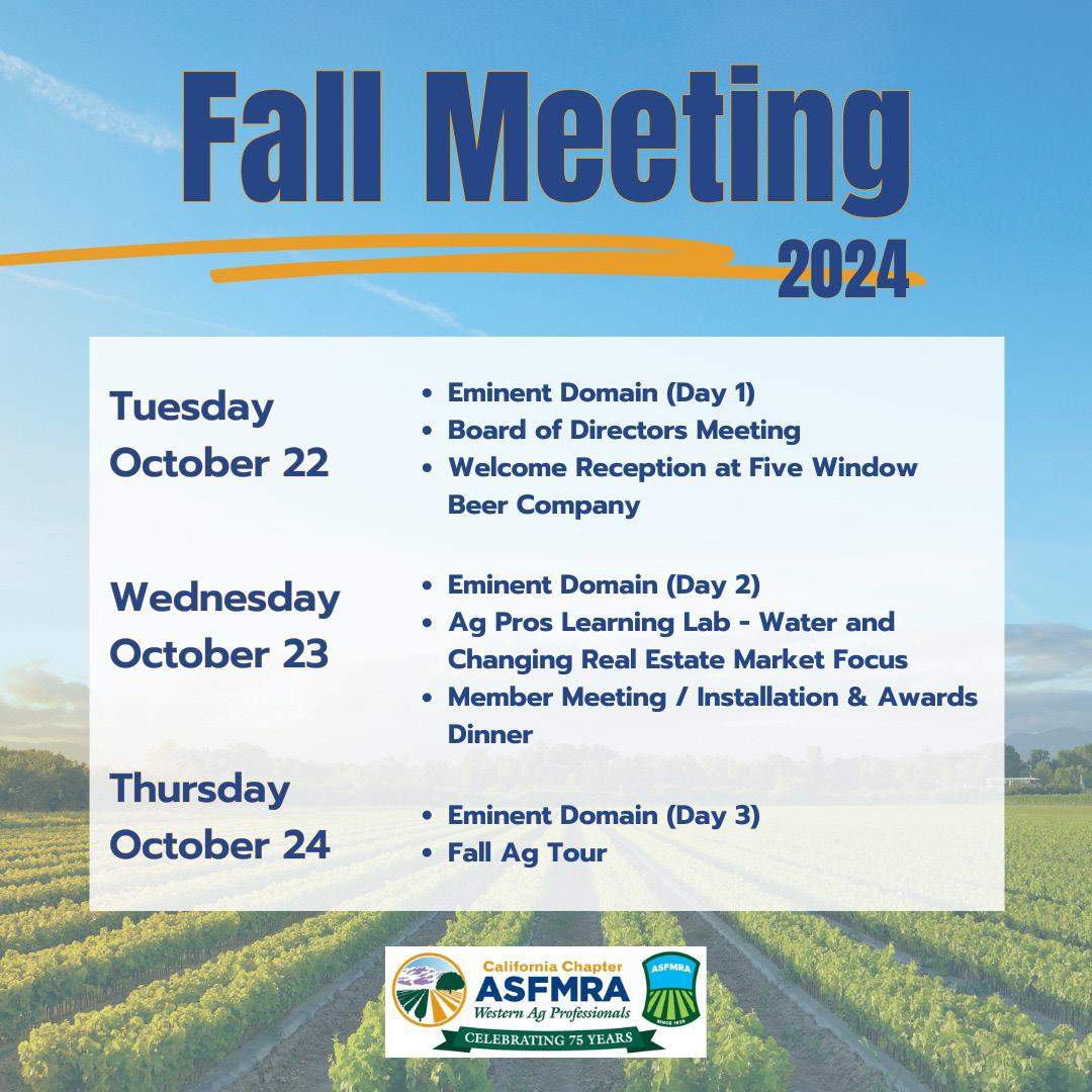 The California Chapter of the American Society of Farm Managers and Rural Appraisers (ASFMRA) will hold its annual Fall Meeting and Tour in October. To register or for more information, visit www.calasfmra.com.